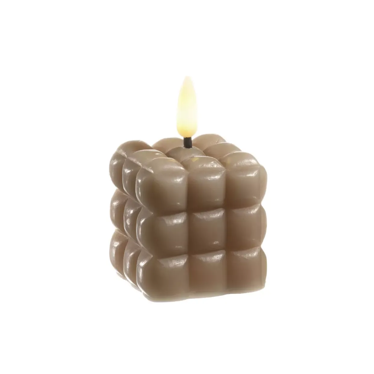 braun klein; quadratische Form mit geschnitzter Oberfläche; 1 LED mit warmweißem Flackerlicht; mit 6 Stunden TimerFunktion; der Schalter: ONOFFTimer.