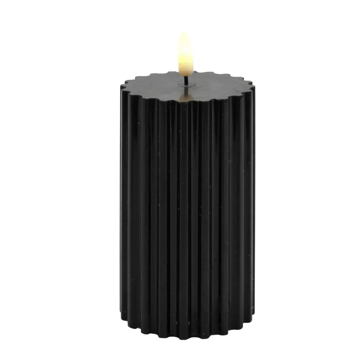 schwarz 15,5 cm; flache Oberseite; vertikal gestreifte geschnitzte Oberfläche; warmweißes Flackerlicht; mit 6h TimerFunktion; ONOFFTIMERSchalter