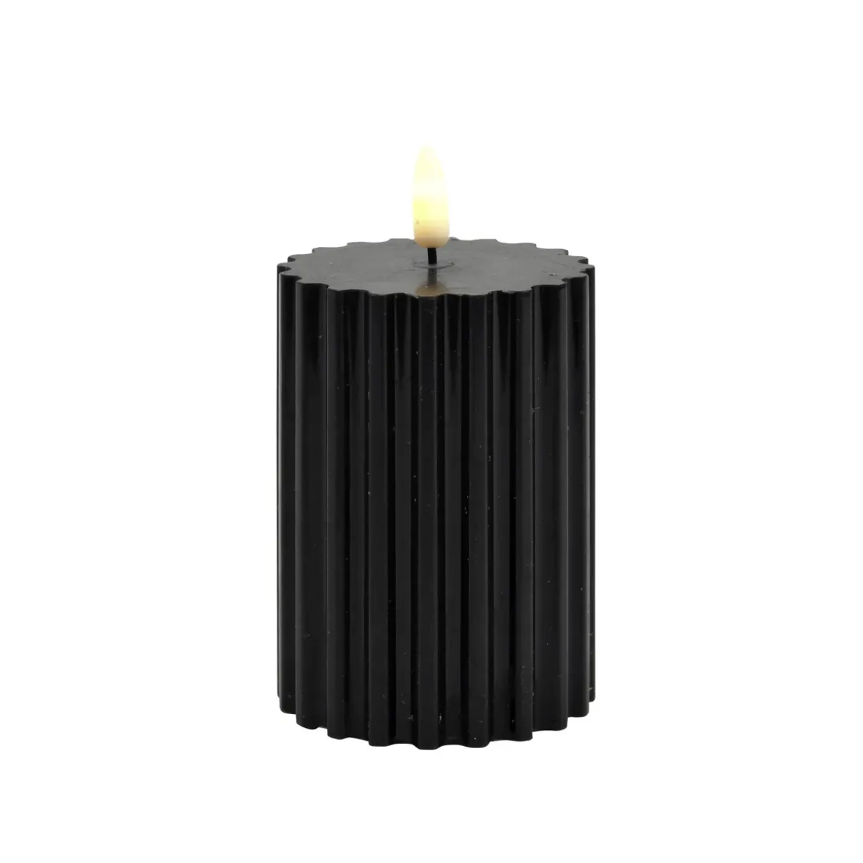 schwarz 13 cm; flache Oberseite; vertikal gestreifte geschnitzte Oberfläche; warmweißes Flackerlicht; mit 6h TimerFunktion; ONOFFTIMERSchalter
