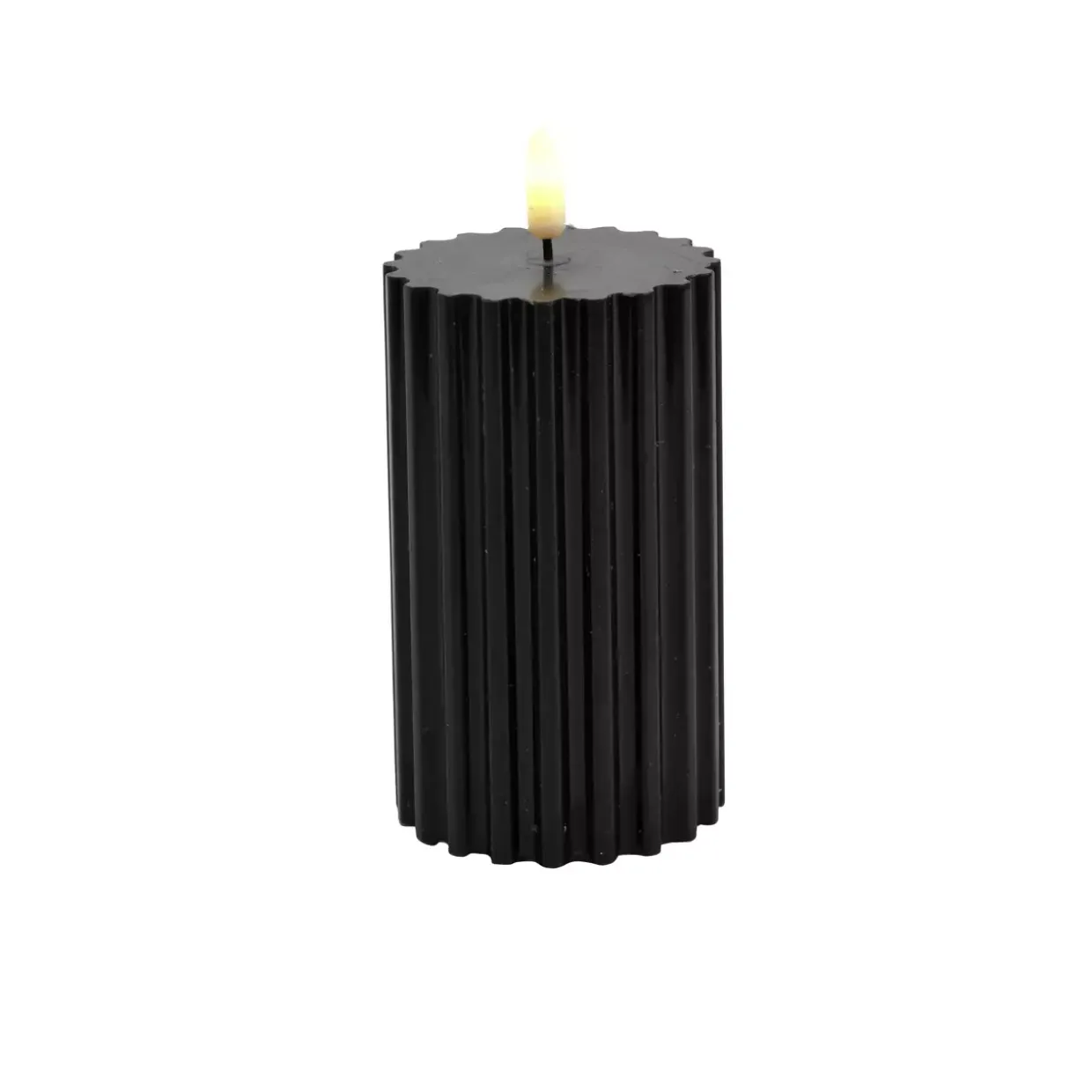 schwarz 18 cm; flache Oberseite; vertikal gestreifte geschnitzte Oberfläche; warmweißes Flackerlicht; mit 6h TimerFunktion; ONOFFTIMERSchalter
