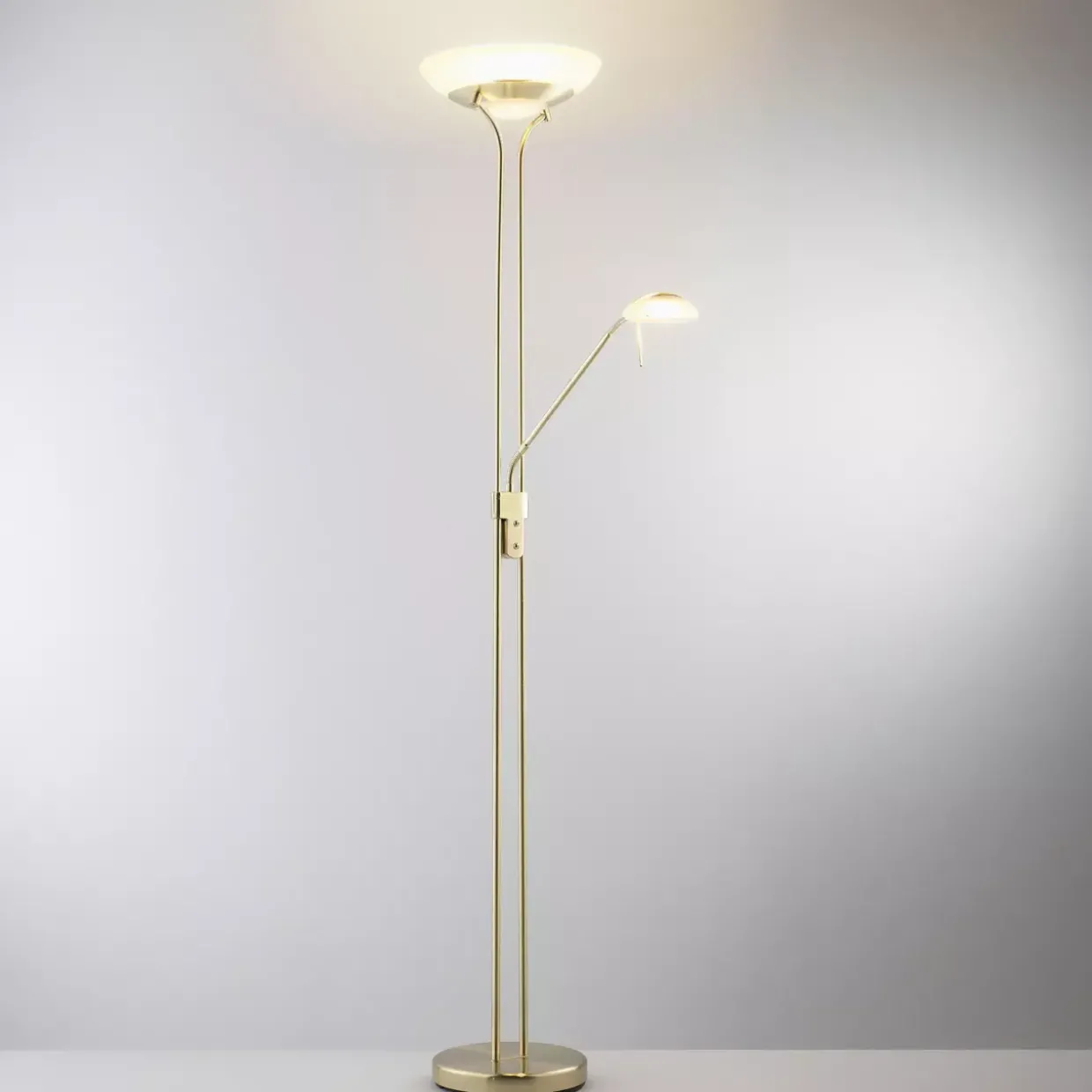 Messingfarbene Eleganz trifft auf moderne Funktionalität. Diese Stehleuchte und Deckenfluter vereint zeitloses Design mit praktischen Features. Mit einer beeindruckenden Lichtleistung von 2960 Lumen sorgt sie für eine gleichmäßige und angenehme Ausleuchtung Ihres Raumes. Die Kombination aus Glas und Metall verleiht dem Produkt eine hochwertige Anmutung, die sich in jedes zeitgemäße Interieur einfügt.
