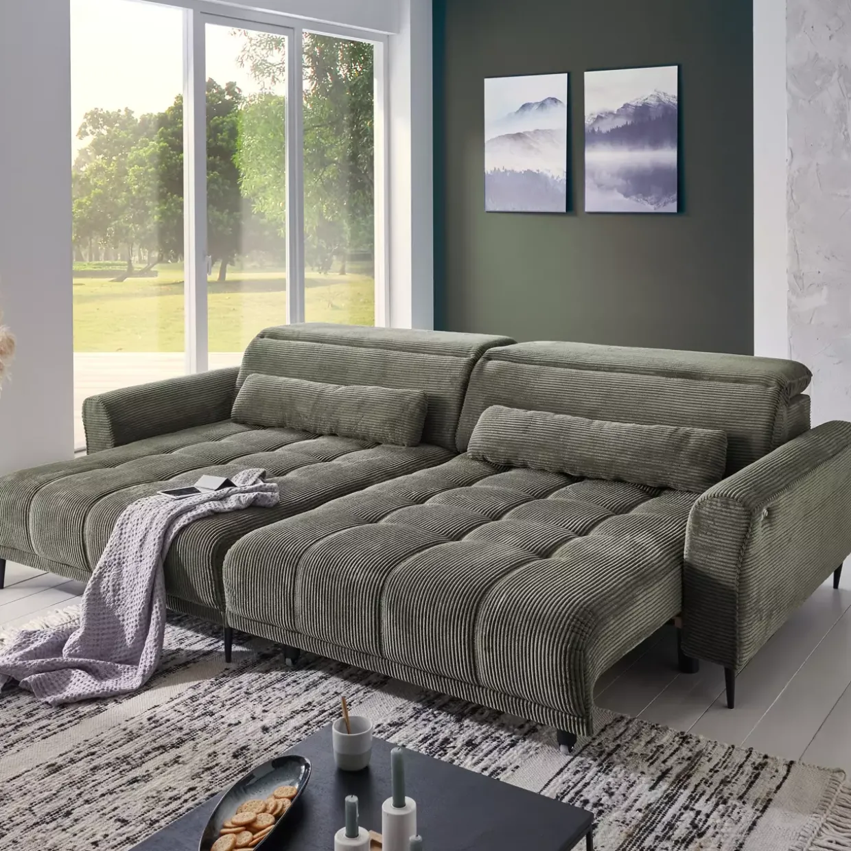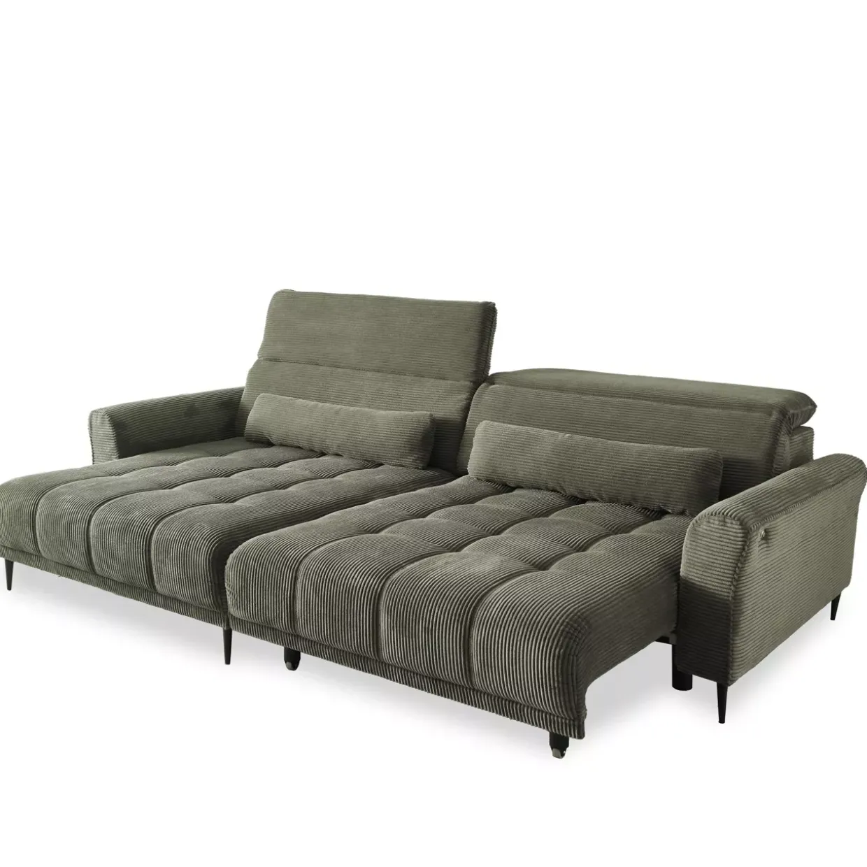inkl. motorischer XXL-Sitztiefenverstellung (60cm) inkl. Kissen Rücken echt bezogen Kopfstützen verstellbar Größe: 179x277cm Farbton: Bezug Hydra grün / Füße Metall schwarz matt Material: Füße Metall / Bezug Stoff Sitzmaße: Sitztiefe 57cm / Sitzhöhe 43cm bestehend aus: 1 Polstergarnitur Liegefläche cm: 126x240cm Stil: Scandi Highlights
