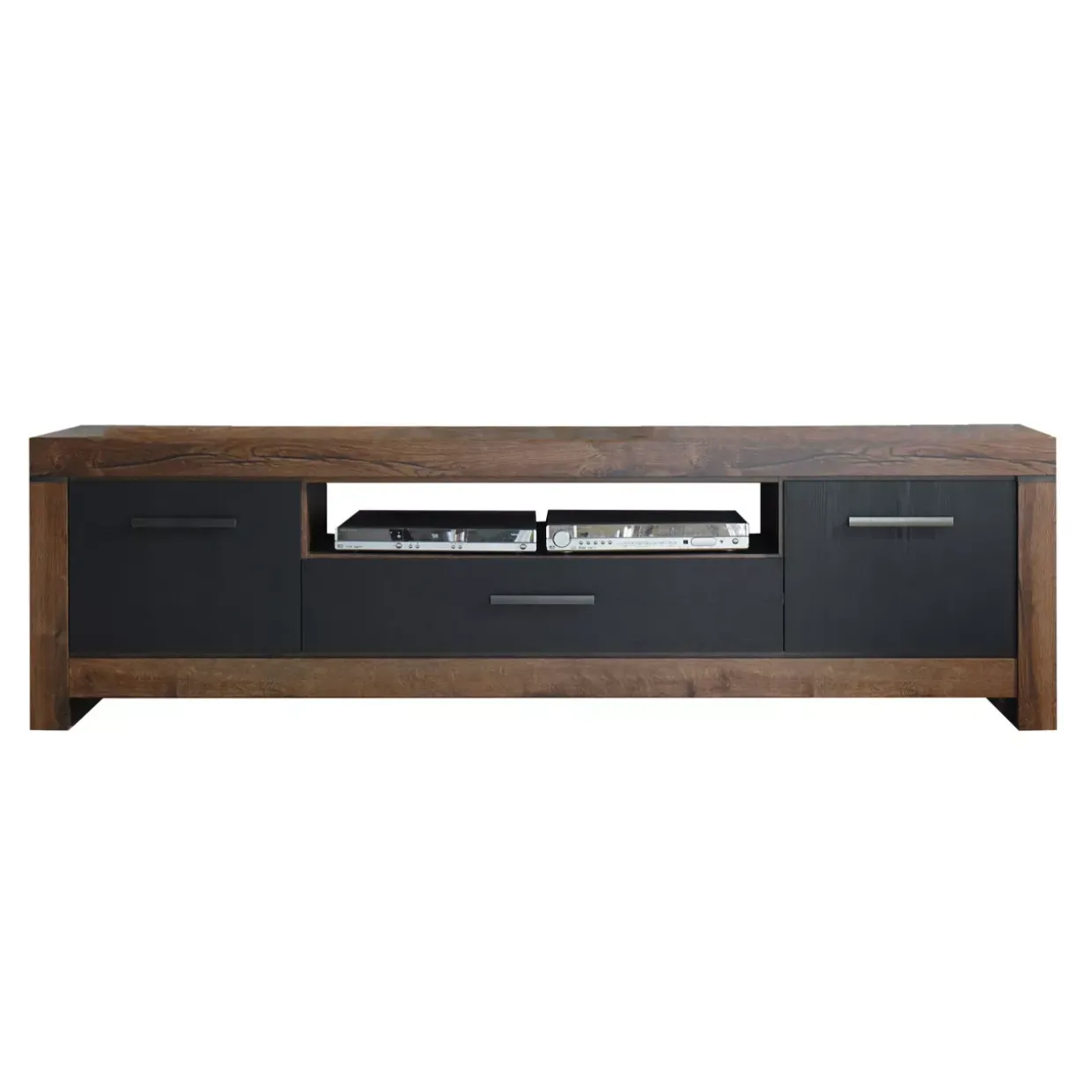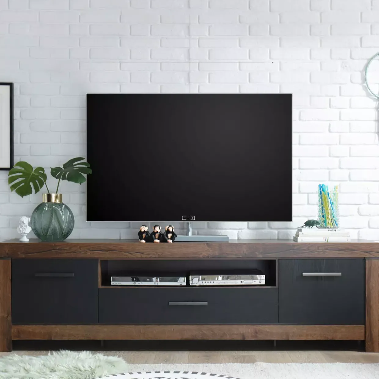 Gefertigt aus hochwertigem Holzwerkstoff, bietet das Lowboard eine beeindruckende Langlebigkeit und überzeugt durch seine stabile Bauweise. Die Kombination aus natürlicher Holzoptik und dunklen Akzenten verleiht dem Möbelstück eine warme und zugleich raffinierte Ausstrahlung, die sowohl in Wohn- als auch in Arbeitsräumen Akzente setzt.