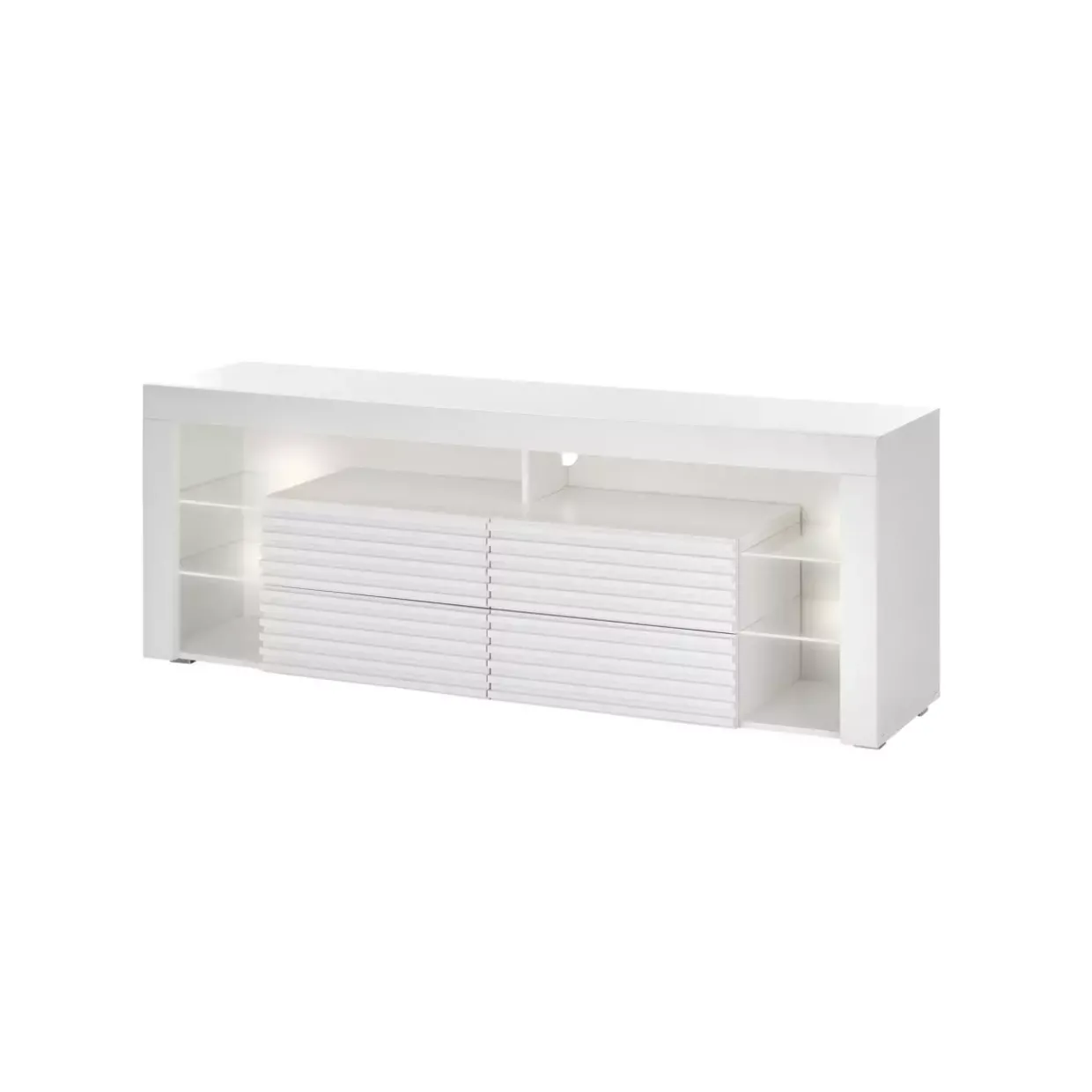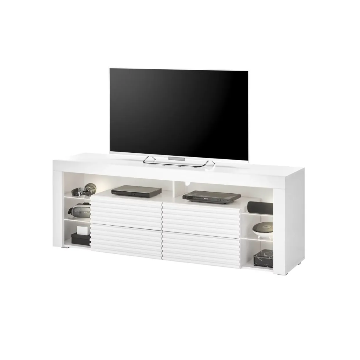 Ein besonderes Highlight ist die integrierte LED-Kantenbeleuchtung, die in warmweißem Licht erstrahlt. Diese sorgt für eine stimmungsvolle Atmosphäre und setzt sowohl das Möbelstück als auch Ihr Wohnzimmer perfekt in Szene. Vier Glaseinlegeböden bieten ausreichend Platz für Ihre Mediengeräte oder dekorative Elemente, während zusätzliche Beleuchtung im Korpus für ein harmonisches Gesamtbild sorgt.