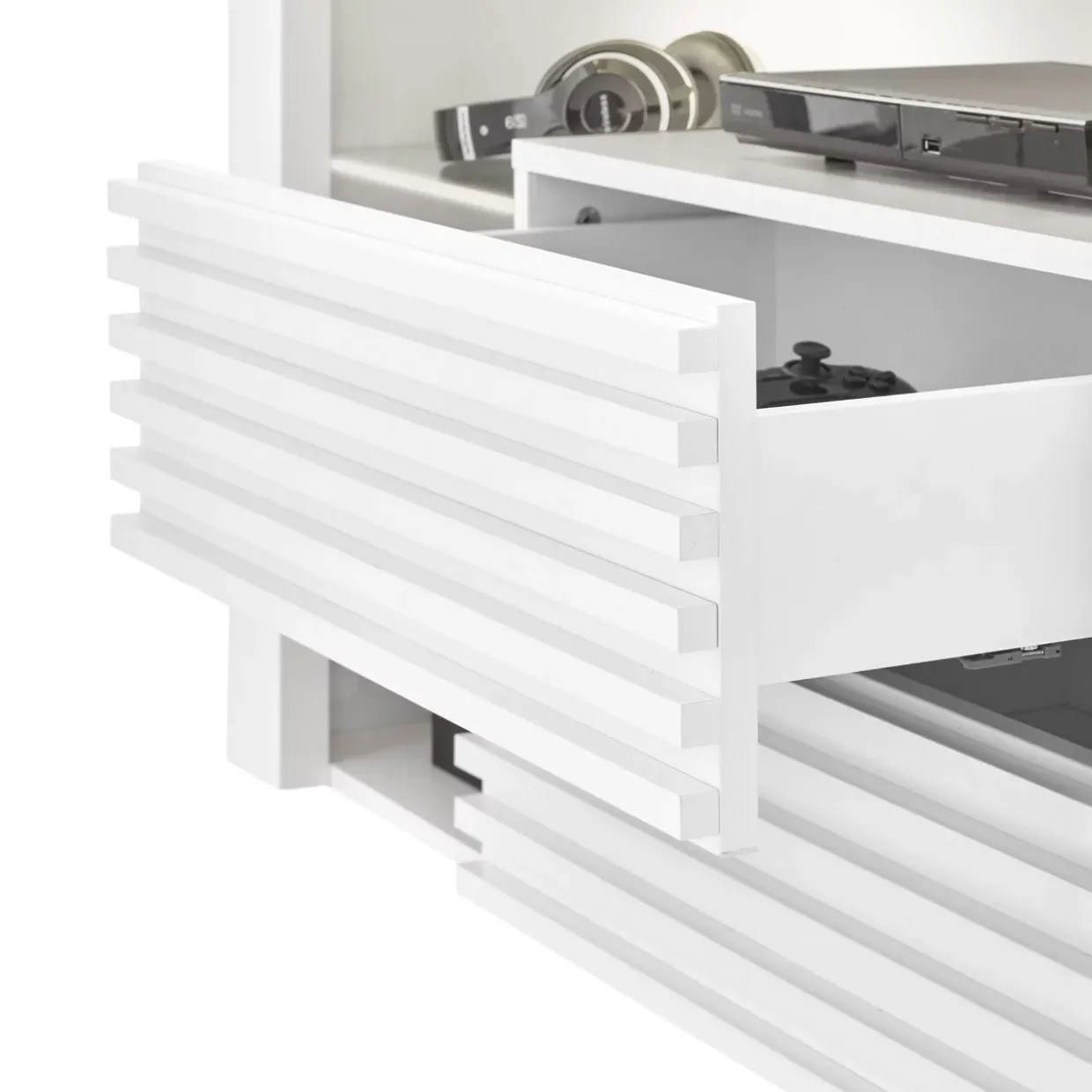 Die Fronten des Lowboards sind mit fest verleimten Stäbchen verziert, was dem Möbelstück eine interessante Struktur und zusätzlichen Charakter verleiht. Dank seiner modernen Ausstrahlung und den praktischen Features wird dieses Lowboard zum unverzichtbaren Bestandteil jeder stilbewussten Wohnzimmereinrichtung.