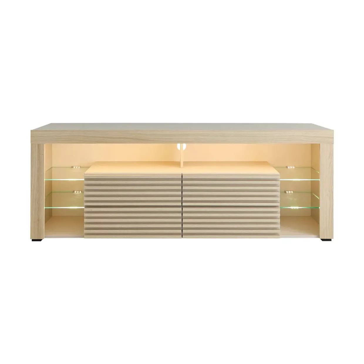 Besonders hervorzuheben ist die integrierte LED-Beleuchtung, die in warmweißem Licht erstrahlt. Diese sorgt nicht nur für eine angenehme Atmosphäre, sondern rückt auch die vier Glasablageböden ins rechte Licht. Der Korpus des Lowboards ist ebenfalls mit einer zusätzlichen Beleuchtung ausgestattet, was einen harmonischen Gesamteindruck schafft.