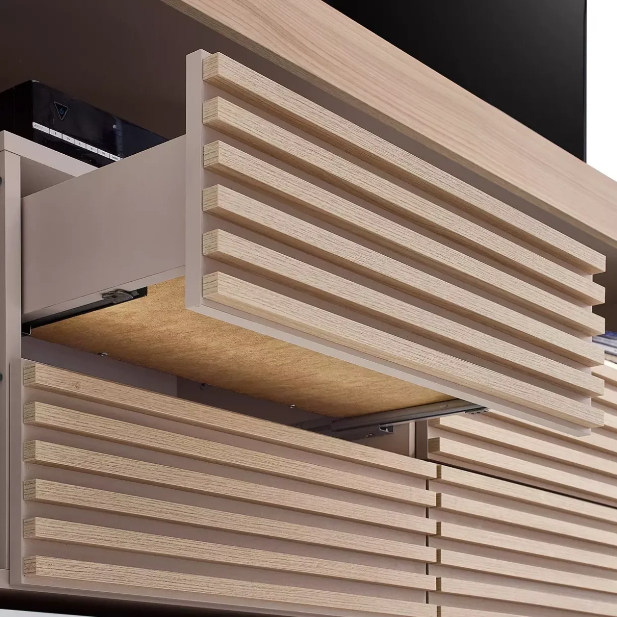 Das Innendekor in kaschmirfarbenem Ton unterstreicht die edle Optik und bietet gleichzeitig viel Stauraum. Vier Schubkästen mit fest verleimten Stäbchenmuster bieten Platz für verschiedene Mediengeräte und Zubehör. Die folierte Oberfläche garantiert eine pflegeleichte Handhabung und Langlebigkeit.