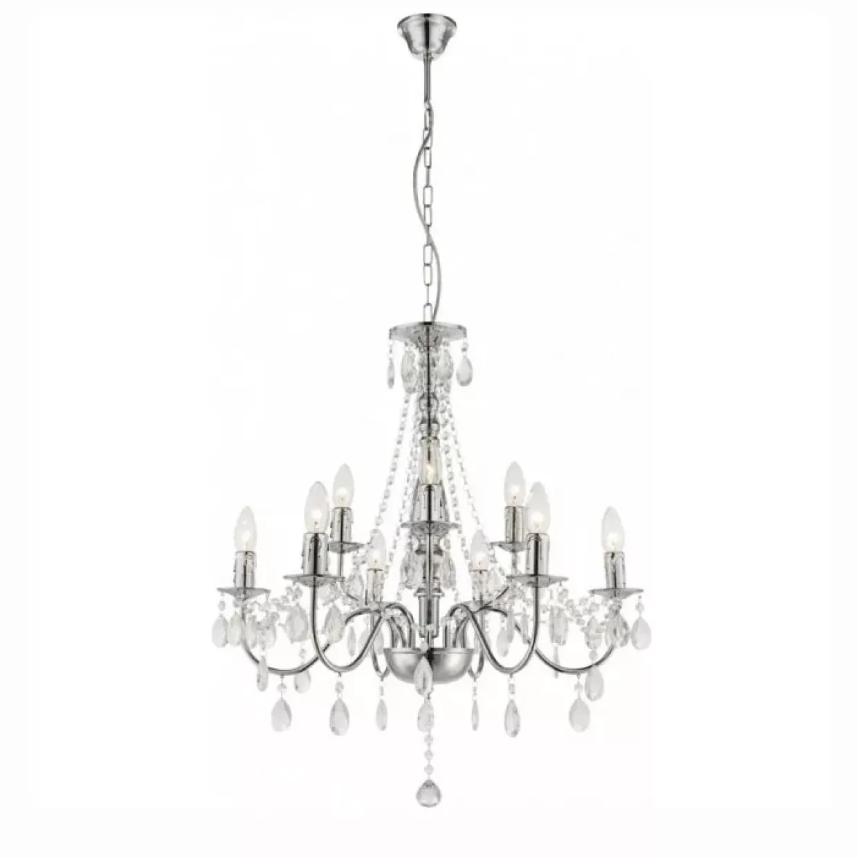 Luster Metall verchromt, Acrylkristalle klar, Kabel PVC transparent, ø: 630mm, H: 1530mm, exkl. 9x E14 40W 230V
