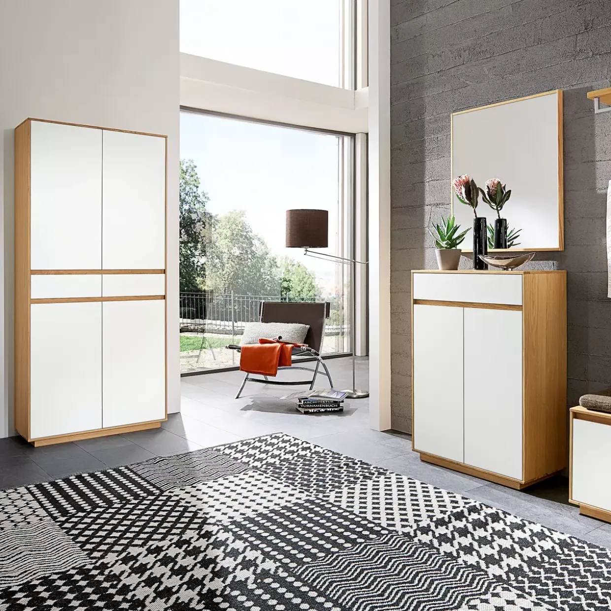 Eleganz trifft Funktionalität: Der Mehrzweckschrank V100 beeindruckt mit seiner modernen Ästhetik und durchdachten Details. Die Kombination aus Eiche Bianco teilmassiv und weißem Lack verleiht jedem Raum eine warme und zugleich zeitgemäße Atmosphäre. Vier individuell gestaltete Türen öffnen sich als Drehtüren und bieten einfachen Zugang zu einem gut organisierten Innenleben.