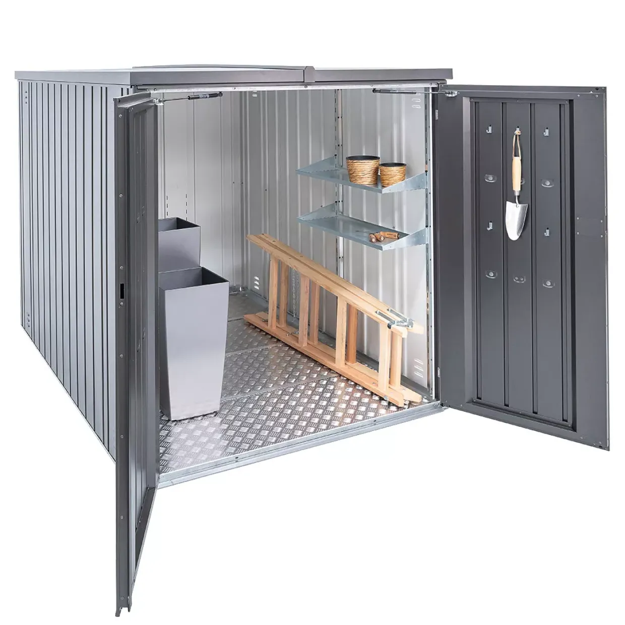 Für die sichere Aufbewahrung von Gartenwerkzeugen sorgt ein ausziehbares Regalsystem mit zwei 150 cm langen Böden. Diese Funktion ermöglicht eine effiziente Organisation und schnellen Zugriff auf benötigte Utensilien. Die aus hochwertigem Stahl gefertigte und feuerverzinkte Oberfläche garantiert Langlebigkeit und Robustheit, selbst bei widrigen Witterungsbedingungen.