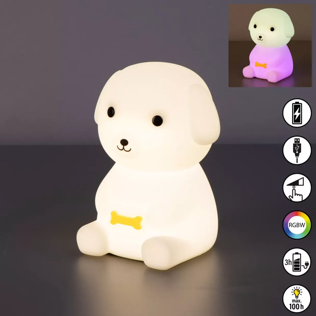 In Form eines charmanten Tieres präsentiert sich die Tischleuchte im modernen Design. Diese stilvolle Leuchte ist nicht nur ein Blickfang, sondern bietet auch praktische Funktionen. Gefertigt aus hochwertigem Silikon, verspricht sie Langlebigkeit und eine angenehme Haptik. Mit einer Lichtleistung von 45 Lumen und warmweißem Farbton erzeugt sie eine behagliche Atmosphäre, die zum Entspannen einlädt.