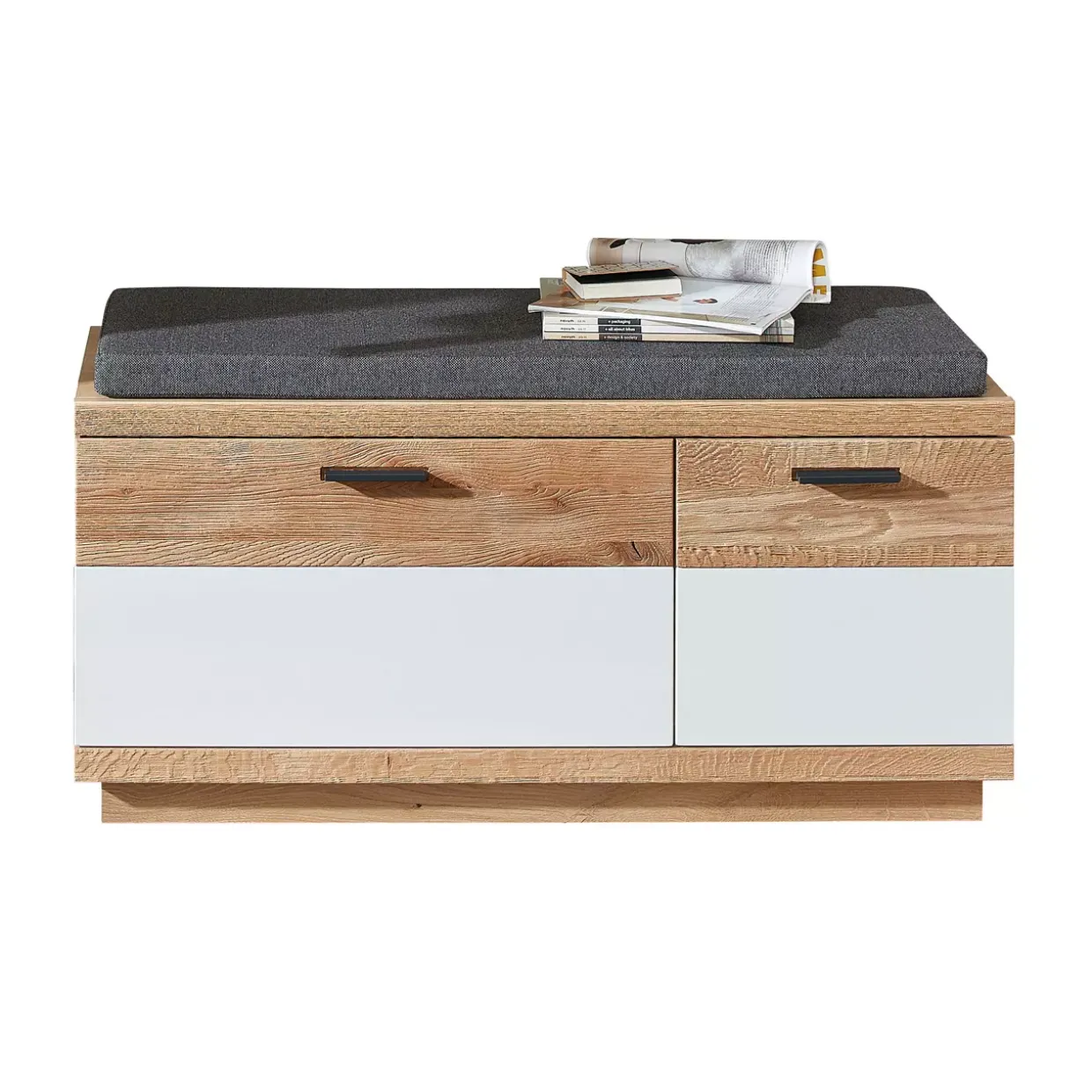 In einem modernen Stil gehalten, vereint die Lisana Bank A-Era Eleganz und Funktionalität in einem Möbelstück. Die Kombination aus Holzwerkstoff, Kunststoff und Metall sorgt für Stabilität und eine ansprechende Optik. Der raffinierte Materialmix trifft auf eine harmonische Farbgebung in Weiß und Wildeiche, die sich mühelos in verschiedene Einrichtungsstile einfügt.Die klare Linienführung und das zeitgemäße Design machen die Bank zu einem besonderen Blickfang in jedem Raum. Ob im Esszimmer, im Flur oder im Wohnbereich, dieses Möbelstück ergänzt Ihre Einrichtung perfekt. Die robuste Bauweise aus hochwertigen Materialien gewährleistet eine lange Lebensdauer und eine hohe Belastbarkeit.Egal, ob Sie zusätzliche Sitzplätze für Gäste benötigen oder einen stilvollen Akzent setzen möchten, die Lisana Bank bietet beides. Der Einsatz von Kunststoff und Metall verleiht der Bank nicht nur Stabilität, sondern auch eine moderne Note. Die Verarbeitung der Materialien ist präzise und sorgt für eine glatte, angenehme Oberfläche.Durch die dezente Farbgebung in Weiß und Wildeiche wirkt die Bank nicht nur optisch ansprechend, sondern auch einladend. Eine perfekte Ergänzung für jedes Zuhause, das Wert auf Stil und Qualität legt. Hier trifft modernes Design auf praktischen Nutzen.
