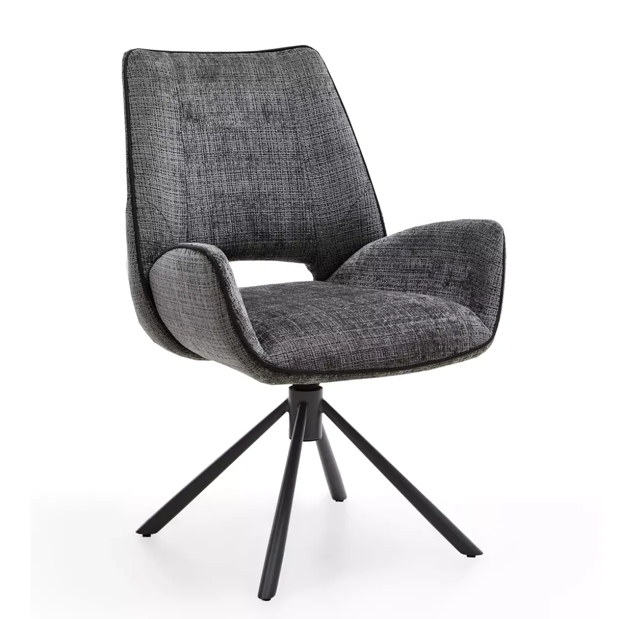 Eine harmonische Kombination aus Leder, Stoff und Metall verleiht dem Stuhl nicht nur eine edle Optik, sondern auch Langlebigkeit und Stabilität. Das Stativgestell bietet eine solide Basis und rundet das Design ästhetisch ab. Die Farbgebung, bestehend aus Cremona C grey mit einem Keder in Leder grey und einem dunkelgrauen Lack, fügt sich nahtlos in verschiedene Einrichtungsstile ein und verleiht jedem Raum eine zeitgemäße Note.