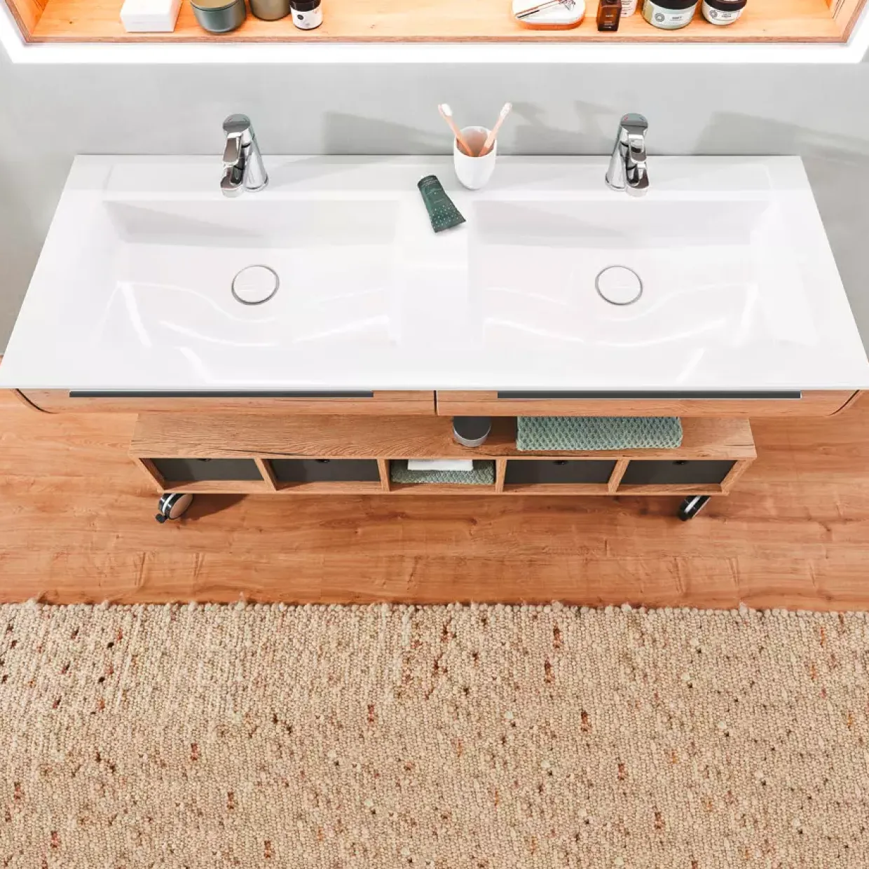 MONDO Palino ist ein Badmöbel-Programm mit eleganten Fronten und Korpus in Halifax Eiche Nachbildung. Die sanft gerundete Form des Waschtischunterschranks schaffen ein harmonisches Stimmungsbild und viel Platz für Ordnung. Der Doppelwaschtisch ist in einem Stoneplus weiß gehalten und besitzt zwei Hahnlöcher, zusätzlich ist er mit zwei Clou Ab- und Überlaufsystemen ausgestattet. Premium-Technik unterstreicht die funktionalen Feinheiten.