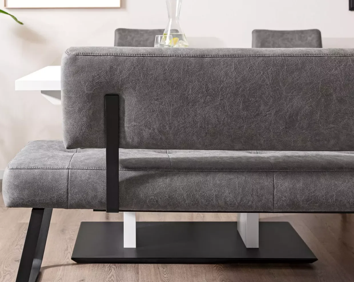 Die Zierkappnaht verleiht der modernen Eckbank einen eleganten Akzent, der sofort ins Auge fällt. Der klare Stil wird durch die harmonische Farbgebung in Grau und Schwarz unterstrichen, was dem Möbelstück eine zeitlose Ästhetik verleiht. Die Kufenform der Füße aus Metall ergänzt das moderne Design, während sie gleichzeitig Stabilität und Langlebigkeit garantiert.