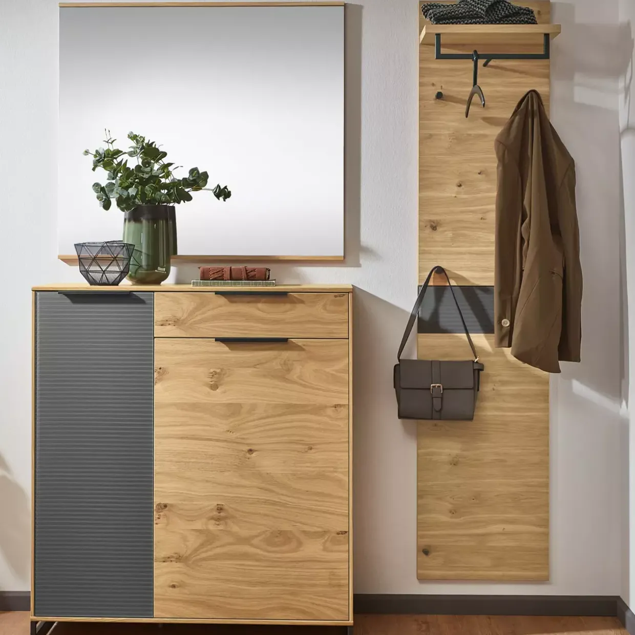 Ein Garderobenpaneel, das durch seine durchdachte Gestaltung und Qualität überzeugt und jedem Eingangsbereich einen Hauch von Eleganz verleiht.