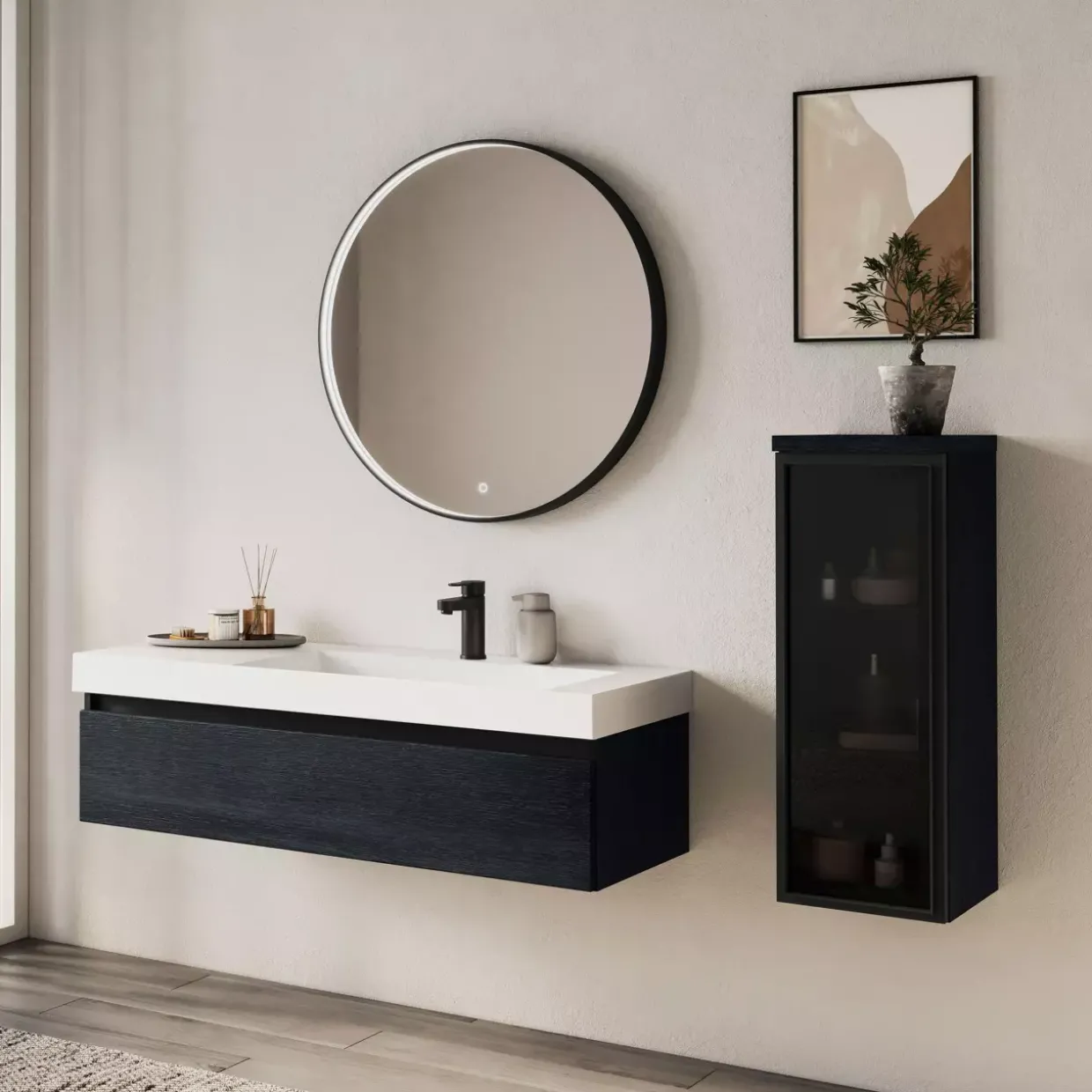Ein besonderer Höhepunkt sind die Glasfachböden, die nicht nur zusätzlichen Stauraum bieten, sondern auch Ihre liebsten Dekorationsstücke gekonnt in Szene setzen. Die Kombination aus schwarzer Eiche und Anthrazit fügt sich nahtlos in moderne Wohnkonzepte ein und sorgt für eine zeitlose Ästhetik.
