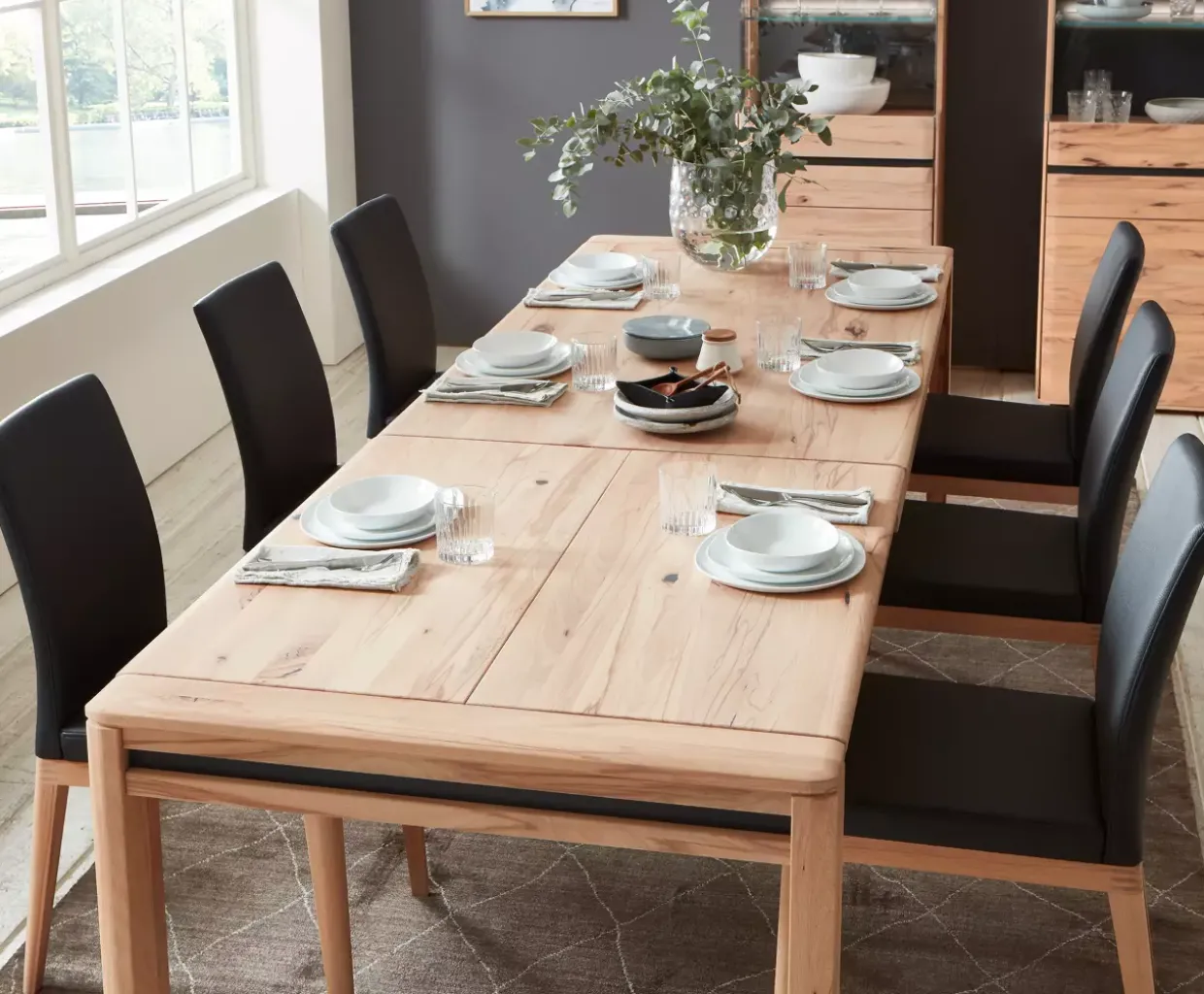 Kernbuche massiv natur trifft auf elegantes Design – der Tisch Danora Plus vereint natürliche Schönheit mit funktionaler Eleganz. Die geölte Oberfläche des hochwertigen Holzes strahlt Wärme aus und bringt einen Hauch von Natur in Ihre Wohnräume. Beeindruckend ist die Vielseitigkeit: Mit einer 100 cm Verlängerung und einem Ausziehbeschlag, der sich bequem mit nur einer Hand bedienen lässt, passt sich der Tisch flexibel Ihren Bedürfnissen an.