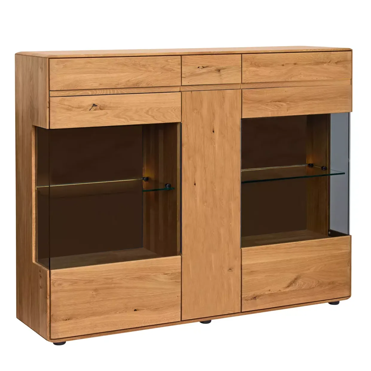 Die natürliche Schönheit der Kernbuche, massiv geölt, verleiht dem Möbelstück eine warme und einladende Ausstrahlung. Diese Kombination aus Holz und Glas schafft ein harmonisches Zusammenspiel, das sowohl in modernen als auch in klassischen Einrichtungsstilen seinen Platz findet. Ein besonderes Highlight ist die raffinierte Anordnung der Türen: eine Holz-/Glastür auf der linken und rechten Seite mit Parsolglas in elegantem Grau sorgt für stilvolle Transparenz. Die mittig positionierte Tür, deren Front aus Holz besteht, unterstreicht die solide Bauweise und bietet praktischen Stauraum. Sieben Holzböden und zwei Glasböden aus Klarglas bieten ausreichend Platz für Ihre Lieblingsstücke. Diese Ausstattungsmerkmale ermöglichen eine flexible Nutzung, die sich perfekt an Ihre Bedürfnisse anpasst. Die präzise Verarbeitung der Materialien gewährleistet eine langlebige Nutzung und bereichert Ihren Wohnraum mit einem Hauch von Eleganz und Funktionalität. Optionale Ausstattungen wie passende Innenschubkästen, eine Rückwand in Schieferoptik oder eine Glasbodenbeleuchtung setzen zusätzliche Akzente und eröffnen weitere Möglichkeiten zur Individualisierung. Das Möbelstück verbindet auf eindrucksvolle Weise Funktionalität mit ästhetischem Anspruch und wird so zum Highlight in Ihrem Zuhause. Entdecken Sie die Symbiose aus Natur und Design, die dieses Möbelstück zu einem unverzichtbaren Begleiter im Alltag macht.
