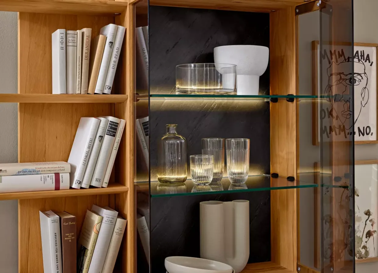 Die Vitrine ergänzt das Ensemble mit einer Kombination aus Holz- und Glastüren sowie insgesamt sechs Einlegeböden, die Raum für Ihre Lieblingsstücke schaffen. Auf Wunsch lässt sich die Rückwand mit Schieferoptik, LED-Glasbodenbeleuchtung und einem 4-Kanal-Funkdimmer veredeln.