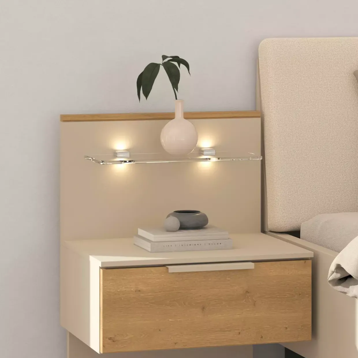 Ein Hauch von Eleganz in Champagner und Asteiche erwartet Sie mit dem modernen Tavela Paneel. Die Kombination aus hochwertiger Asteiche und Holzwerkstoff verleiht diesem Möbelstück eine besondere Klasse, die durch die integrierte Beleuchtung stimmungsvoll in Szene gesetzt wird. Glas als Materialwahl für den Ablageboden bietet nicht nur optischen Reiz, sondern auch praktische Vorteile. Es schafft eine transparente Leichtigkeit, die Ihre Dekorationsobjekte perfekt zur Geltung bringt. Die klare Linienführung des modernen Stils harmoniert ideal mit der natürlichen Maserung des Holzes und setzt in jedem Raum einen stilvollen Akzent.Das Tavela Paneel ist mehr als nur ein funktionales Möbelstück. Es ist ein Statement für geschmackvolle Einrichtung und durchdachtes Design. Der Glasablageboden bietet ausreichend Platz für Bücher, Vasen oder andere dekorative Elemente, während die Beleuchtung eine warme Atmosphäre schafft.Hochwertige Materialien und eine sorgfältige Verarbeitung machen dieses Paneel zu einem langlebigen Begleiter für Ihr Zuhause. Wenn Sie auf der Suche nach einem Möbelstück sind, das sowohl praktisch als auch ästhetisch ansprechend ist, könnte das Tavela Paneel Ihre Erwartungen übertreffen. Lassen Sie sich von der zeitlosen Schönheit und der Funktionalität dieses einzigartigen Möbelstücks überzeugen.