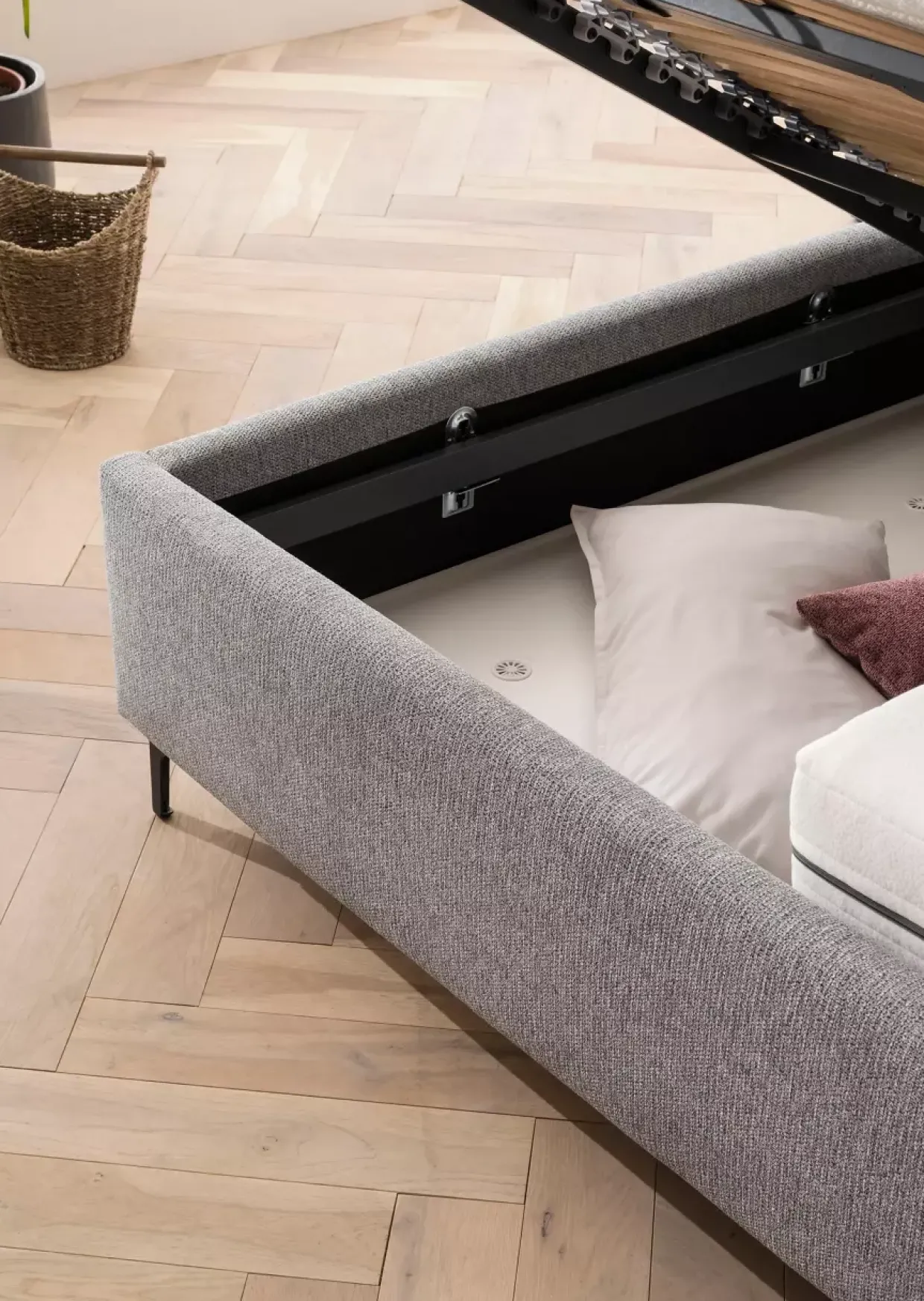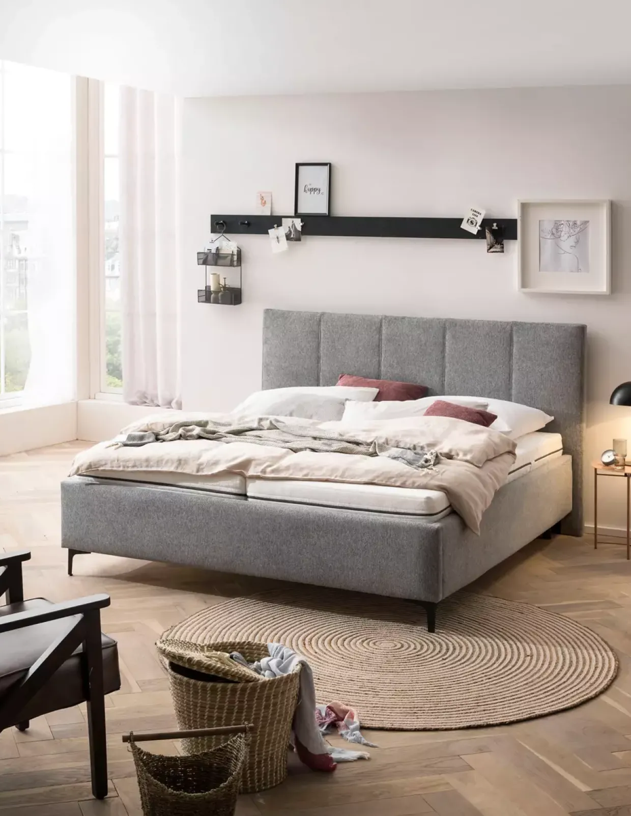 Ein Polsterbett, das Design und Funktionalität geschickt vereint, schafft in Ihrem Schlafzimmer eine Oase der Ruhe und Entspannung. Die subtile Farbgebung harmoniert hervorragend mit verschiedenen Einrichtungsstilen und bietet Ihnen die Möglichkeit, Ihre persönliche Note mit Dekorationen und Textilien zu ergänzen.