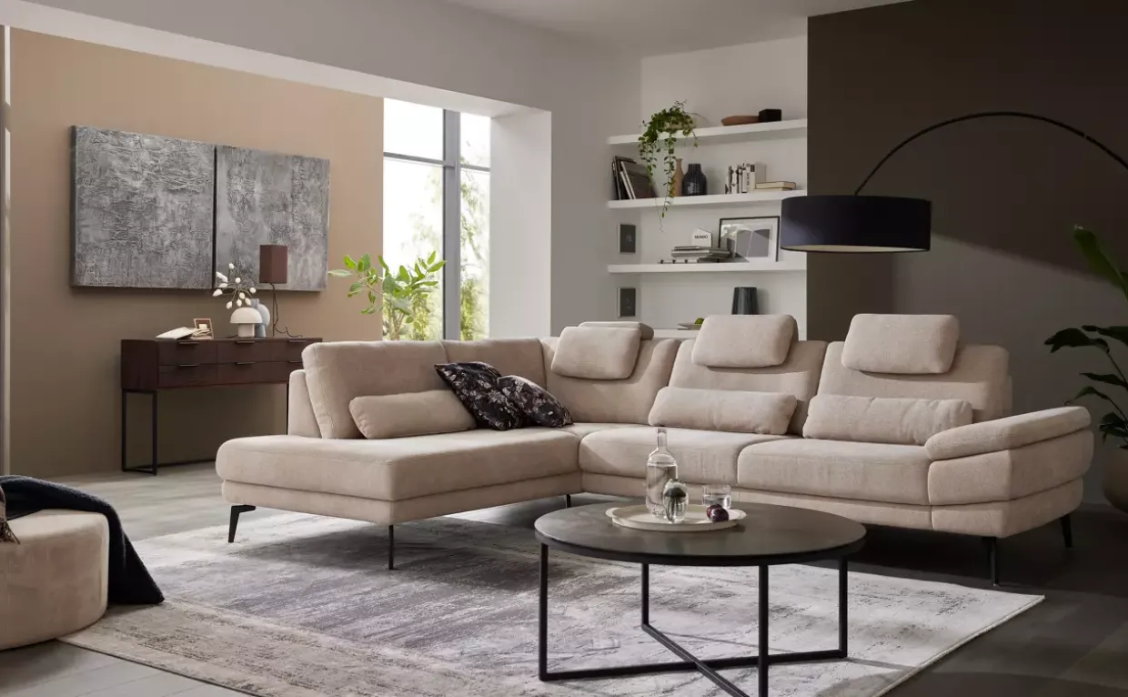 Eine Farbkombination aus Mads sand und schwarz verleiht dem Möbelstück eine zeitlose Eleganz. Hochwertige Materialien wie Stoff, Holz, Holzwerkstoff und Metall sorgen für eine robuste und langlebige Konstruktion. Der SOFTsitz mit seiner innovativen Sandwichbauweise aus zwei verschiedenen Kaltschaumqualitäten bietet ein unvergleichliches Sitzerlebnis.