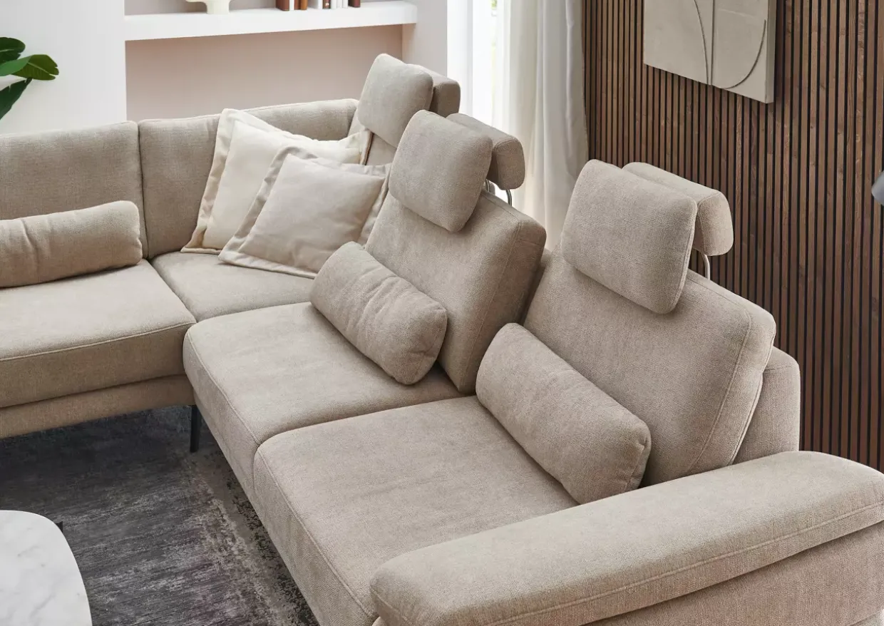 Mit der Premiumkopfstütze, die in Höhe und Neigung verstellbar ist, bietet die Civita MONDO Polstergarnitur höchsten Komfort für moderne Wohnräume. Diese Garnitur vereint stilvolles Design mit funktionaler Vielseitigkeit. Die Armteilverstellung und die Sitztiefenverstellung im 3er Sofa ermöglichen eine individuelle Anpassung an Ihre Bedürfnisse.