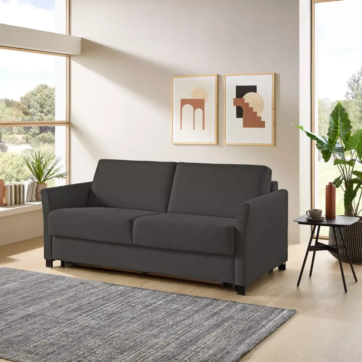 Dank des Echtbezugs auf der Rückseite kann das Sofa frei im Raum platziert werden, ohne an Charme einzubüßen. Die Materialwahl aus Stoff und Metall spricht für Langlebigkeit und einen hochwertigen Look. Dieses Schlafsofa ist nicht nur ein Möbelstück, sondern ein Ort der Entspannung und Funktionalität. Ideal für diejenigen, die Wert auf Qualität und modernes Design legen, ohne auf Komfort zu verzichten.