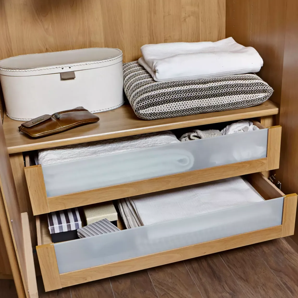 Flexibilität wird großgeschrieben, denn dieser Schubkasten eignet sich sowohl für Drehtüren- als auch für Schwebetürenschränke. Ob Sie ihn stapeln oder auf beliebiger Höhe einbauen möchten, Sie haben alle Freiheiten, Ihre Wohnräume individuell zu gestalten. Die Glasfront verleiht dem Möbelstück nicht nur eine edle Optik, sondern lässt auch den Inhalt stilvoll erstrahlen.