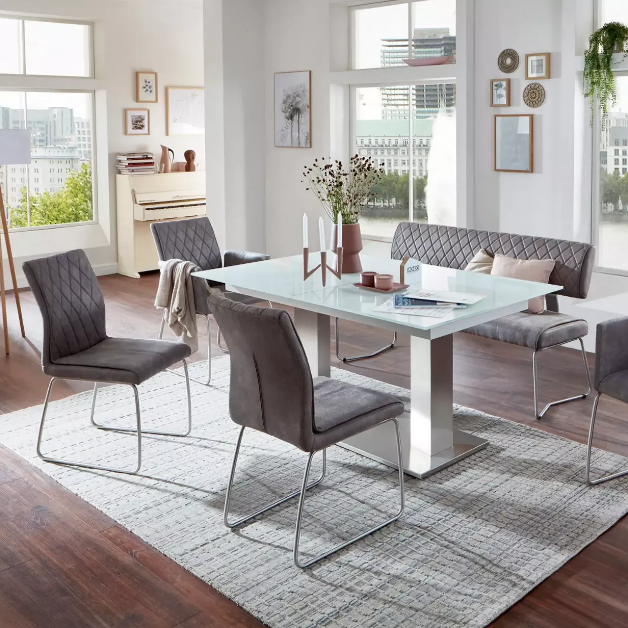 Moderne Eleganz trifft auf Funktionalität: Der Moka Stuhl verkörpert beides auf eindrucksvolle Weise. In einer zeitgemäßen Kombination aus Zink hellgrauem Stoff und edlem Edelstahl gehalten, passt dieser Stuhl perfekt in jedes moderne Ambiente. Die Kufenform der Füße verleiht dem Design nicht nur optische Leichtigkeit, sondern sorgt auch für Stabilität und Komfort.