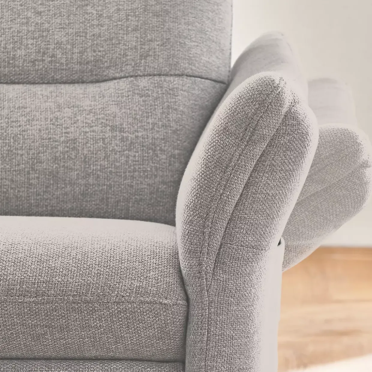 Monte Beige trifft auf Edelstahloptik in dieser exquisiten Polstergarnitur. Eleganz und Komfort vereinen sich in einem Design, das konventionelle Stilvorstellungen neu interpretiert. Der Einsatz von Stoff und Metall sorgt für eine harmonische Kombination, die durch die Chenille-Gewebeart mit ihren Textilarten Polyamid und Polyester abgerundet wird. Eine besondere Raffinesse bietet die verstellbare Arm- und Kopfteilfunktion, die individuell an Ihre Bedürfnisse angepasst werden kann. Ausgestattet mit der Superlastic med-Sitztechnologie, garantiert diese Polstergarnitur höchsten Sitzkomfort. Das manuell ausklappbare Kopfteil und die elektrische Cumurex-Funktion im äußeren Sitz bieten zusätzliche Flexibilität und Bequemlichkeit.Die legere Polsterung lädt zum Verweilen ein, während der Rückenbezug in Echtbezug-Qualität für eine luxuriöse Haptik sorgt. Ein weiteres Highlight ist die Cumurex-Funktion, die ein ausklappbares Fußteil sowie die Verstellung der Rückenlehne und Kopfstütze umfasst. Ein Akku mit außenliegender Ladestation sorgt dafür, dass die elektrische Funktionalität stets einsatzbereit ist. Diese Polstergarnitur ist mehr als nur ein Möbelstück. Sie ist ein Ort der Entspannung und des Wohlbefindens, der sich perfekt in Ihr Zuhause einfügt.