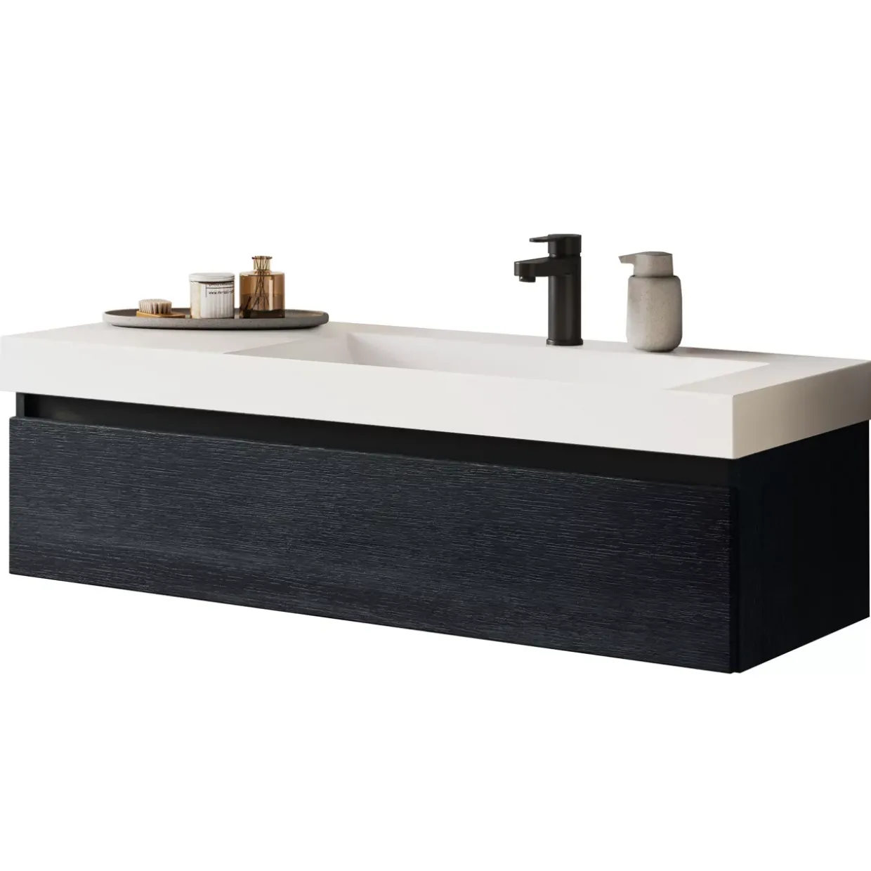 Ein weiterer Pluspunkt ist der Metallauszug mit Einzugsdämpfung, der sanftes und leises Schließen gewährleistet. Dieses Detail unterstreicht nicht nur die Funktionalität, sondern auch die Langlebigkeit des Möbelstücks. Die Farbkombination aus weißem und schwarzem Eichenholz verleiht dem Waschtischunterschrank einen modernen und zeitlosen Look, der sich problemlos in verschiedene Einrichtungsstile integrieren lässt.