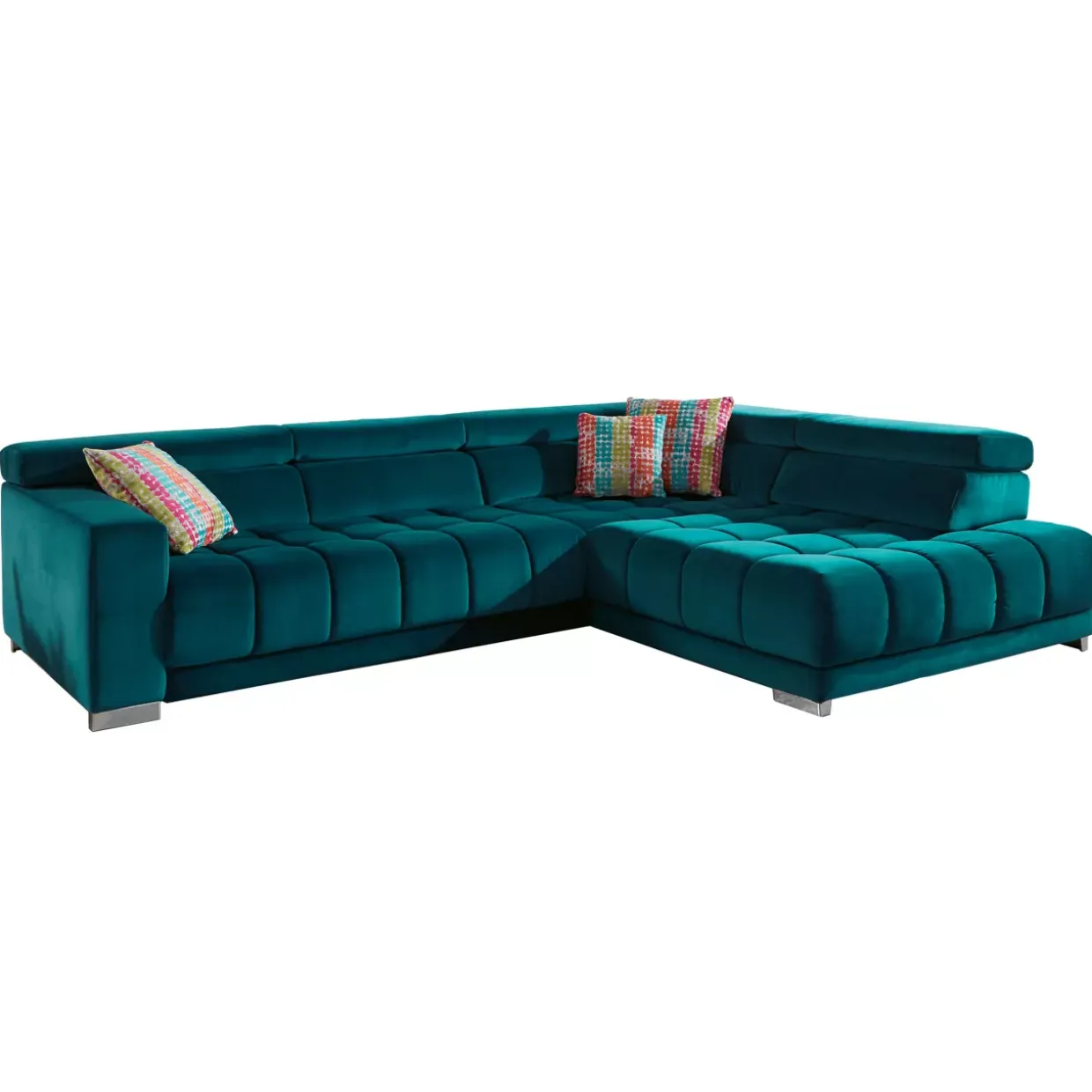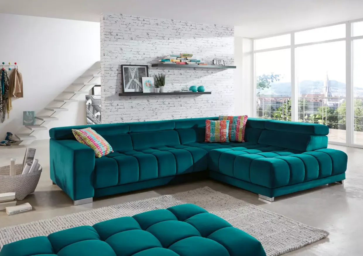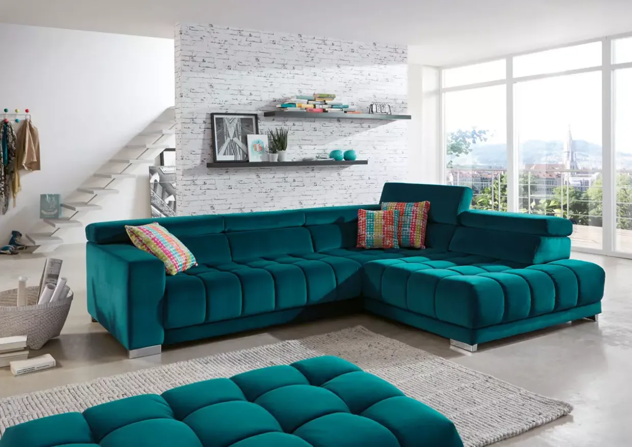 Eine Polstergarnitur, die durch ihre moderne Ästhetik besticht, ist eine Bereicherung für jedes Wohnzimmer. Die Kombination aus Feincord im Farbton Salsa petrol und silberfarben glänzendem Metall verleiht dem Raum eine elegante und zugleich behagliche Atmosphäre. Der Bezug im Feincord Salsa verspricht nicht nur einen optischen Genuss, sondern bietet auch eine angenehme Haptik.