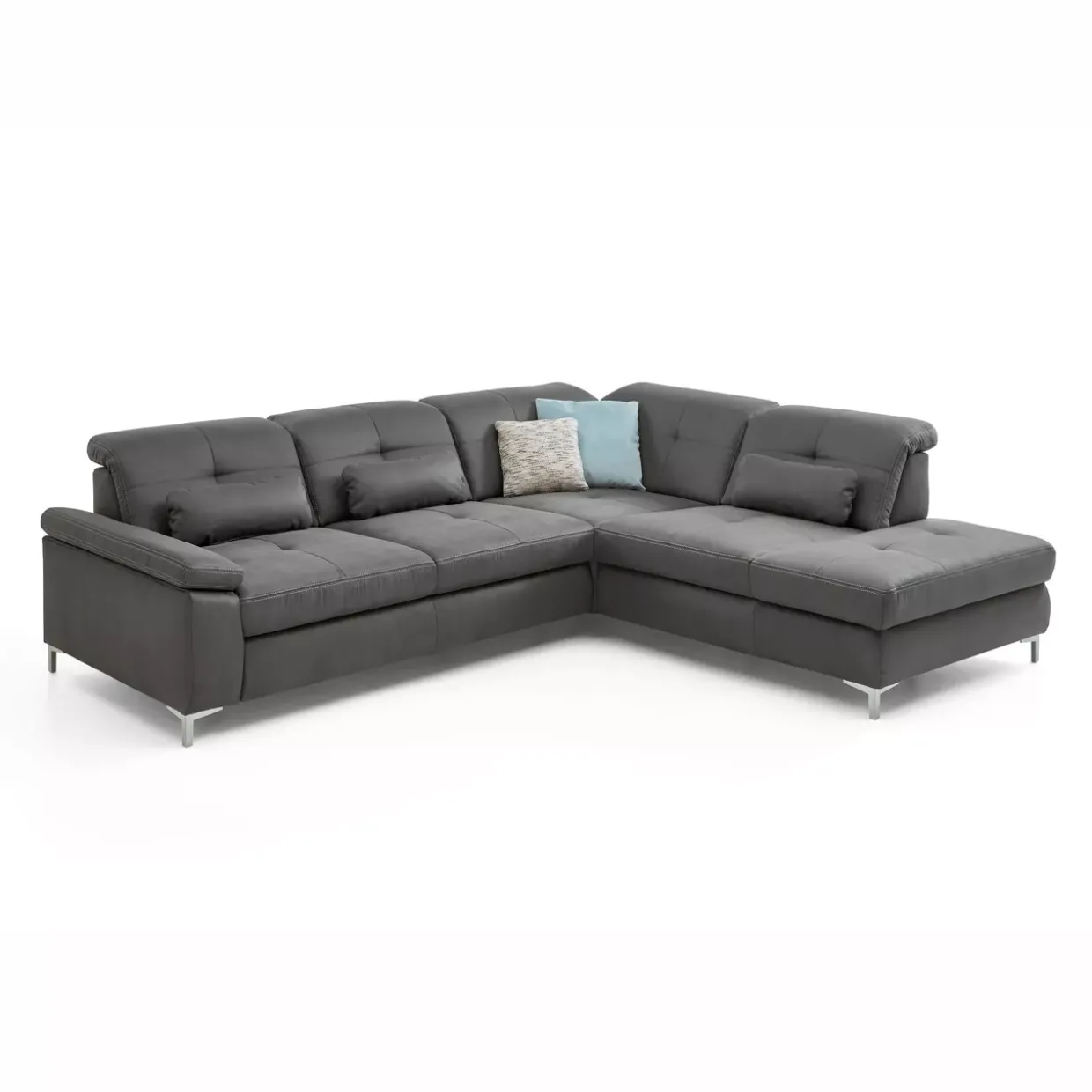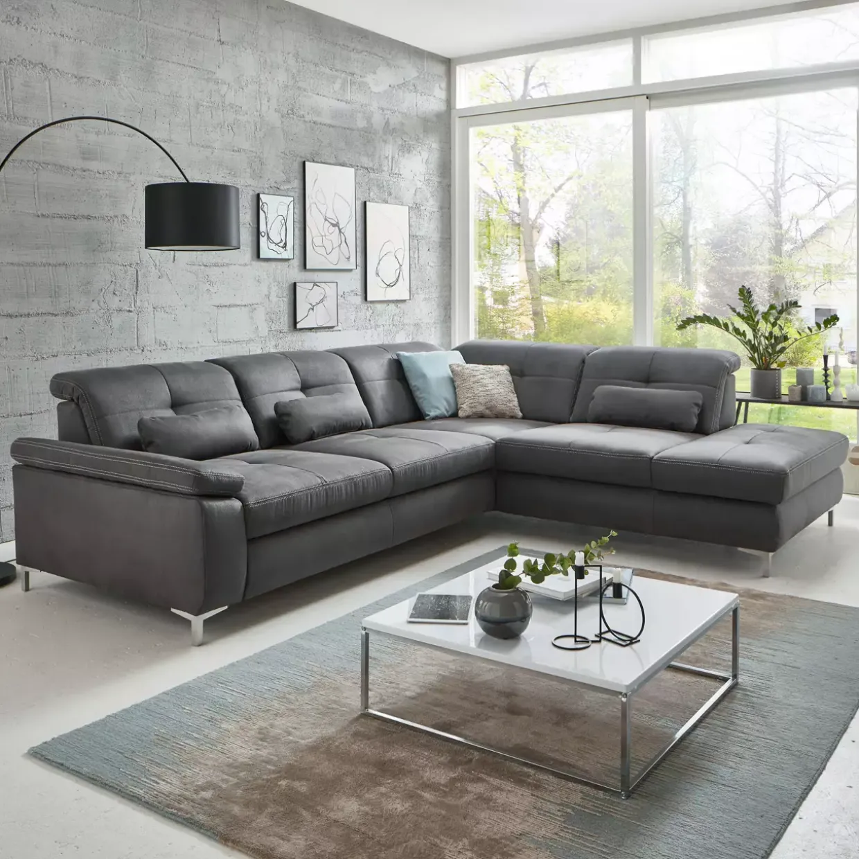 Die Polstergarnitur präsentiert sich in einem schlichten Uni-Muster, das sich harmonisch in verschiedene Wohnstile einfügt. Mit einer variablen Sitztiefe von 59 bis 79 cm passt sie sich individuell an Ihre Sitzgewohnheiten an.
