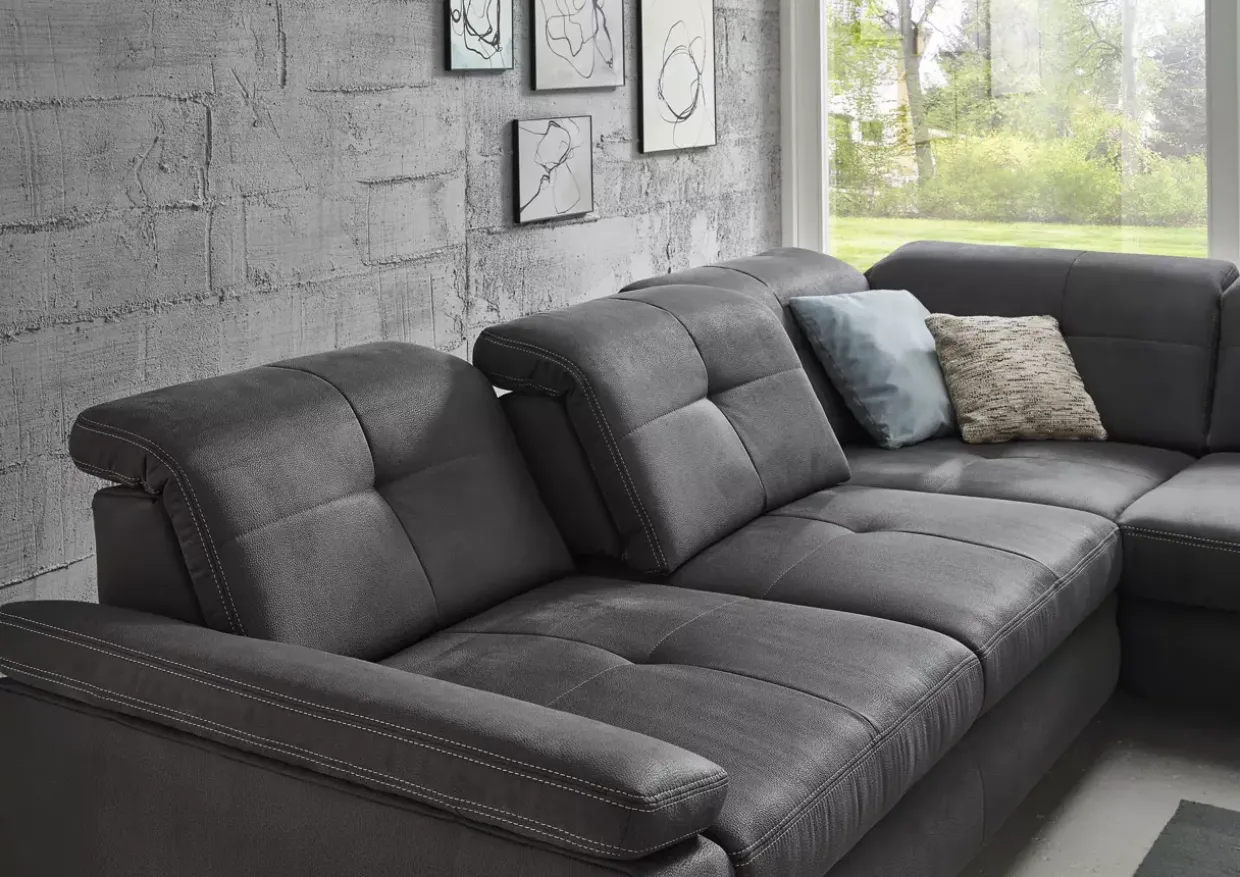 Ein besonderes Highlight ist die Doppelsteppnaht mit Kontrastfaden in Beige, die der Garnitur eine raffinierte Note verleiht. Diese sorgfältige Verarbeitung spricht für die hohe Qualität und Langlebigkeit des Möbels. Die Sitztiefenverstellung ermöglicht Ihnen, den Sitzkomfort individuell anzupassen und sich optimal zu entspannen. Zusätzliche Funktionen runden das durchdachte Design dieser Polstergarnitur ab und machen sie zu einem vielseitigen Begleiter in Ihrem Zuhause.