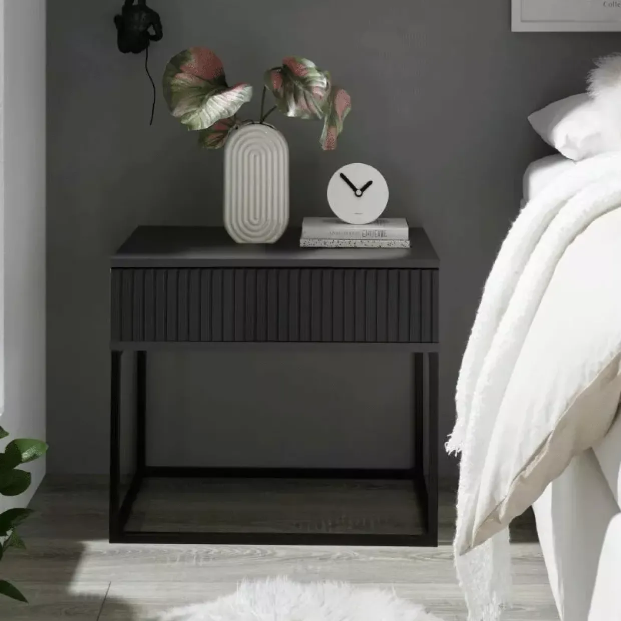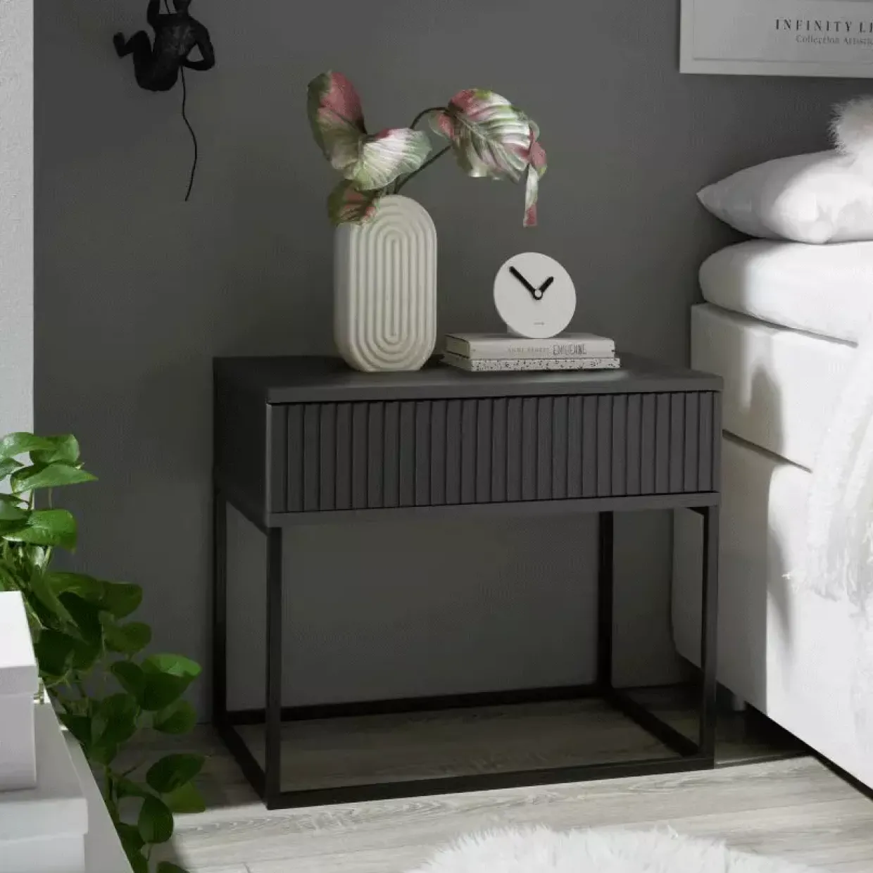 Das Material aus hochwertigem Holzwerkstoff und Metall verspricht Langlebigkeit und eine solide Bauweise, die den täglichen Anforderungen gerecht wird. Eine Nachtkommode, die nicht nur durch ihr Aussehen besticht, sondern auch durch ihre praktischen Eigenschaften überzeugt. Die klaren Linien und das minimalistische Design fügen sich nahtlos in verschiedene Raumkonzepte ein, ohne aufdringlich zu wirken.