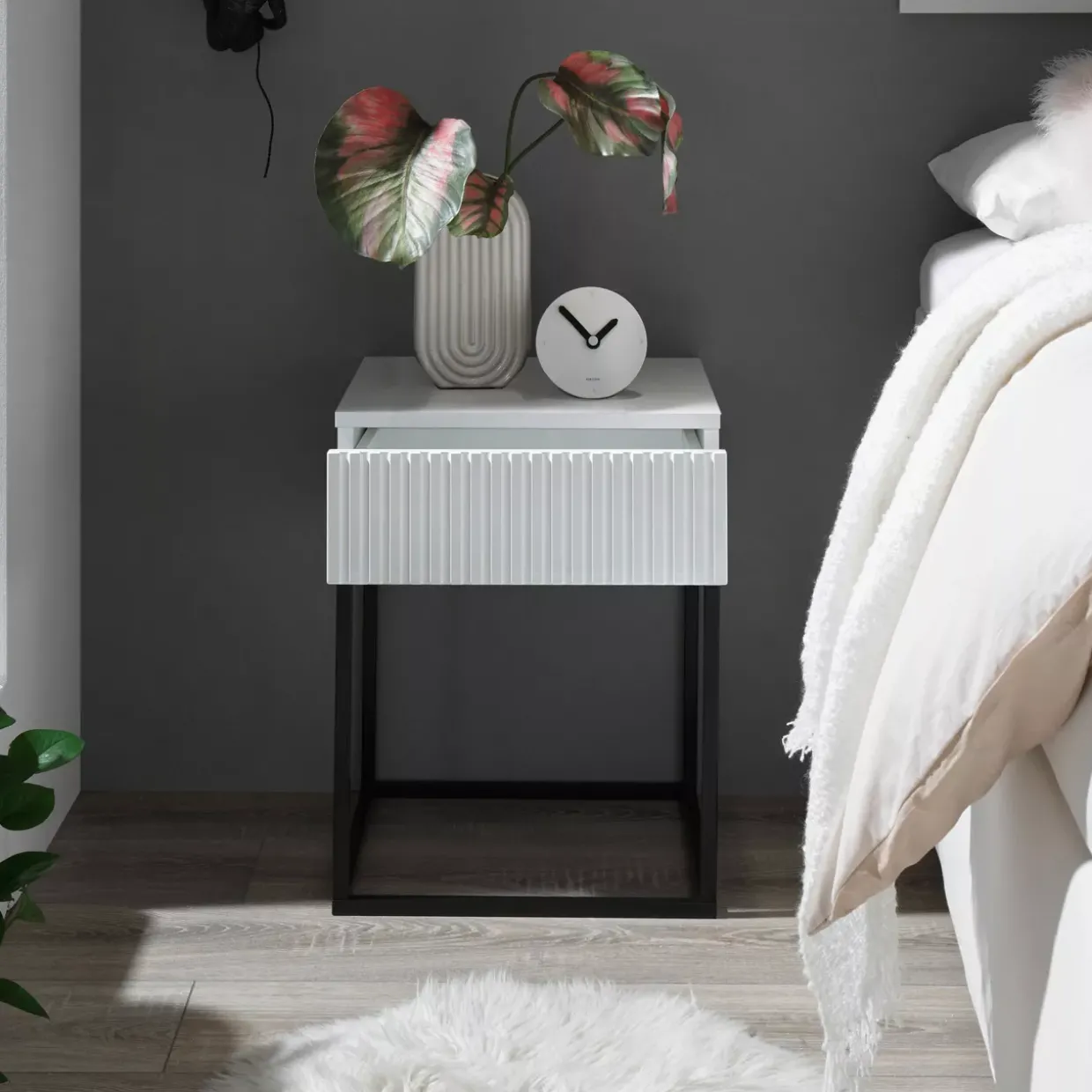 Eine Farbpalette in Weiß und Schwarz bietet vielseitige Gestaltungsmöglichkeiten und lässt Raum für kreative Einrichtungsideen. Diese kontrastierenden Töne sorgen für eine klare, stilvolle Präsenz im Raum und setzen subtile Akzente, die Ihre Schlafzimmereinrichtung bereichern. Der elegante Stil der Nachtkommode macht sie zu einem Highlight in Ihrem Schlafzimmer, das sowohl optisch ansprechend als auch praktisch ist.