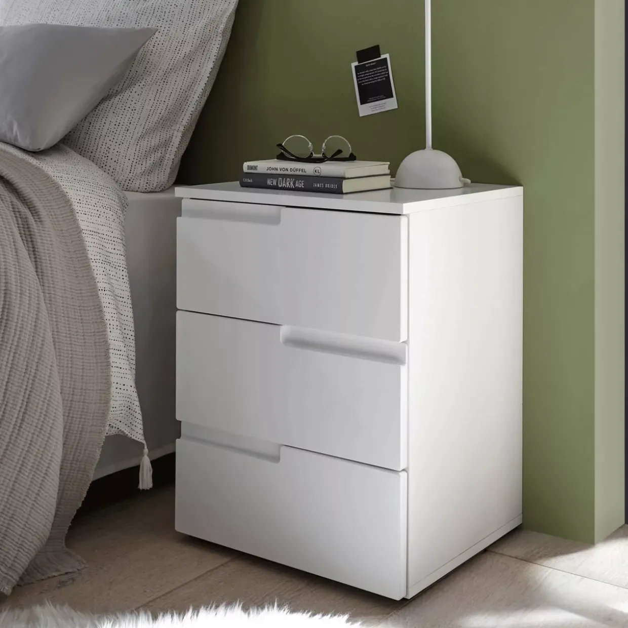 Ein moderner Stil zeichnet die elegante Nachtkommode aus. Diese in einem zeitlosen Weiß gehaltene Kommode fügt sich harmonisch in jedes Schlafzimmerambiente ein und strahlt eine ruhige und klare Ästhetik aus. Bestehend aus hochwertigem Holzwerkstoff, verbindet sie Robustheit mit einem ansprechenden Design, das sowohl funktional als auch stilvoll ist.
