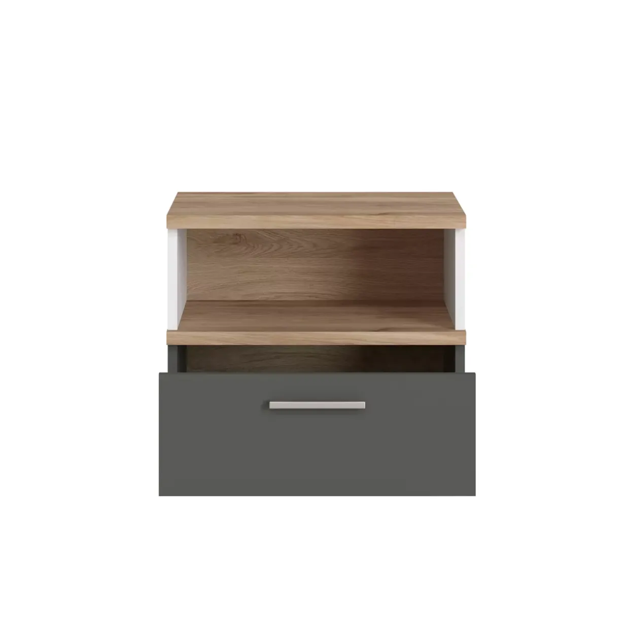 Eckige Formen verleihen Ihrer Einrichtung eine klare und moderne Struktur. Der Nachttisch aus der Serie TWENTY besticht durch sein zeitgemäßes Design, das sich harmonisch in jedes Schlafzimmer einfügt. Die Kombination aus Alpinweiß, Graphit und der warmen Honey Castello Eiche schafft eine angenehme Atmosphäre, die zum Verweilen einlädt.