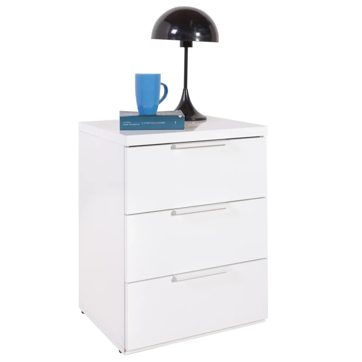 Hochglanz in Weiß ist das dominierende Stilmerkmal dieser modernen Nachtkonsole. Der elegante Look wird durch die Kombination aus edlem Holzwerkstoff und robustem Metall unterstrichen, was sowohl in der Optik als auch in der Langlebigkeit überzeugt. Ein besonderes Highlight bilden die drei geräumigen Schubkästen, die für Ordnung und Übersichtlichkeit sorgen.