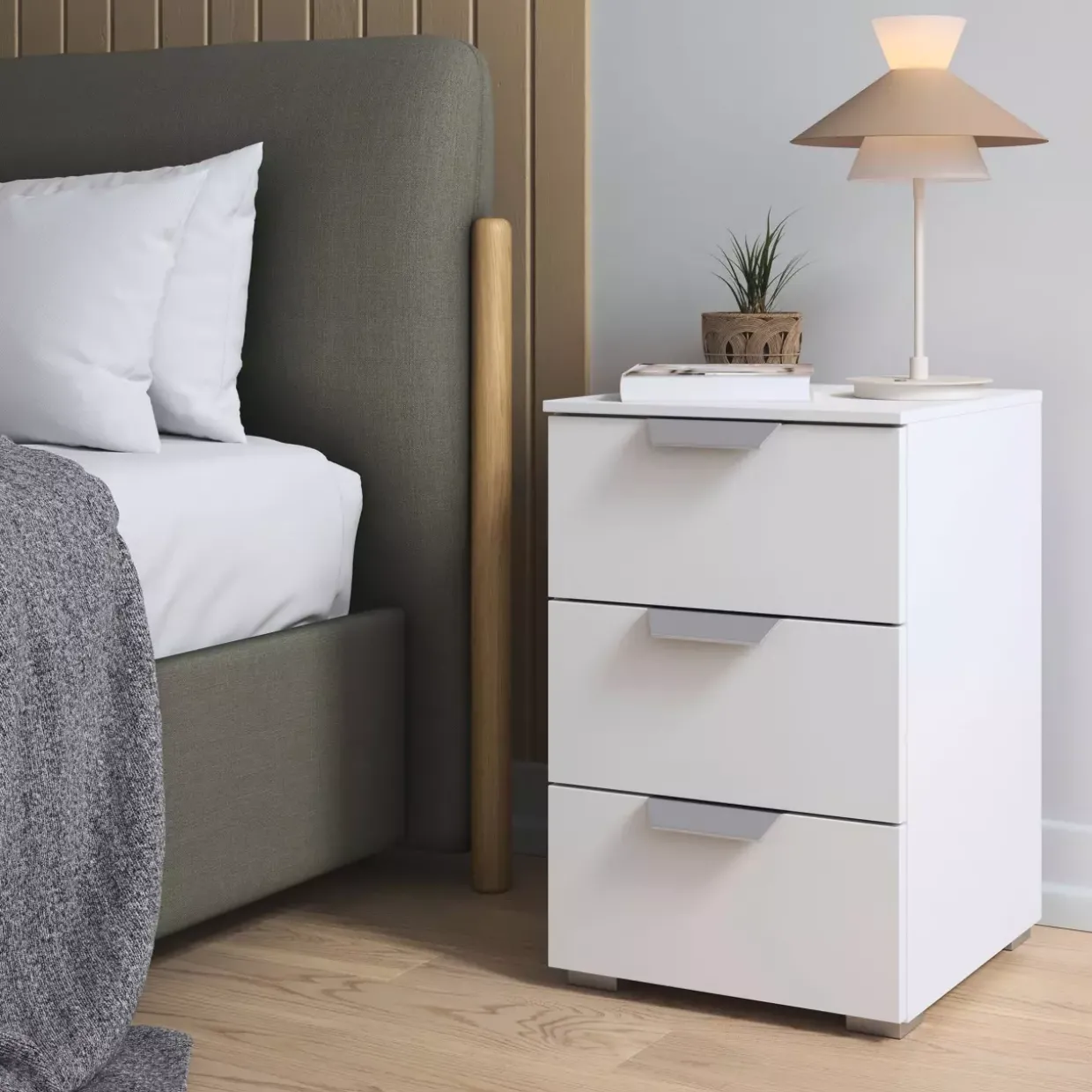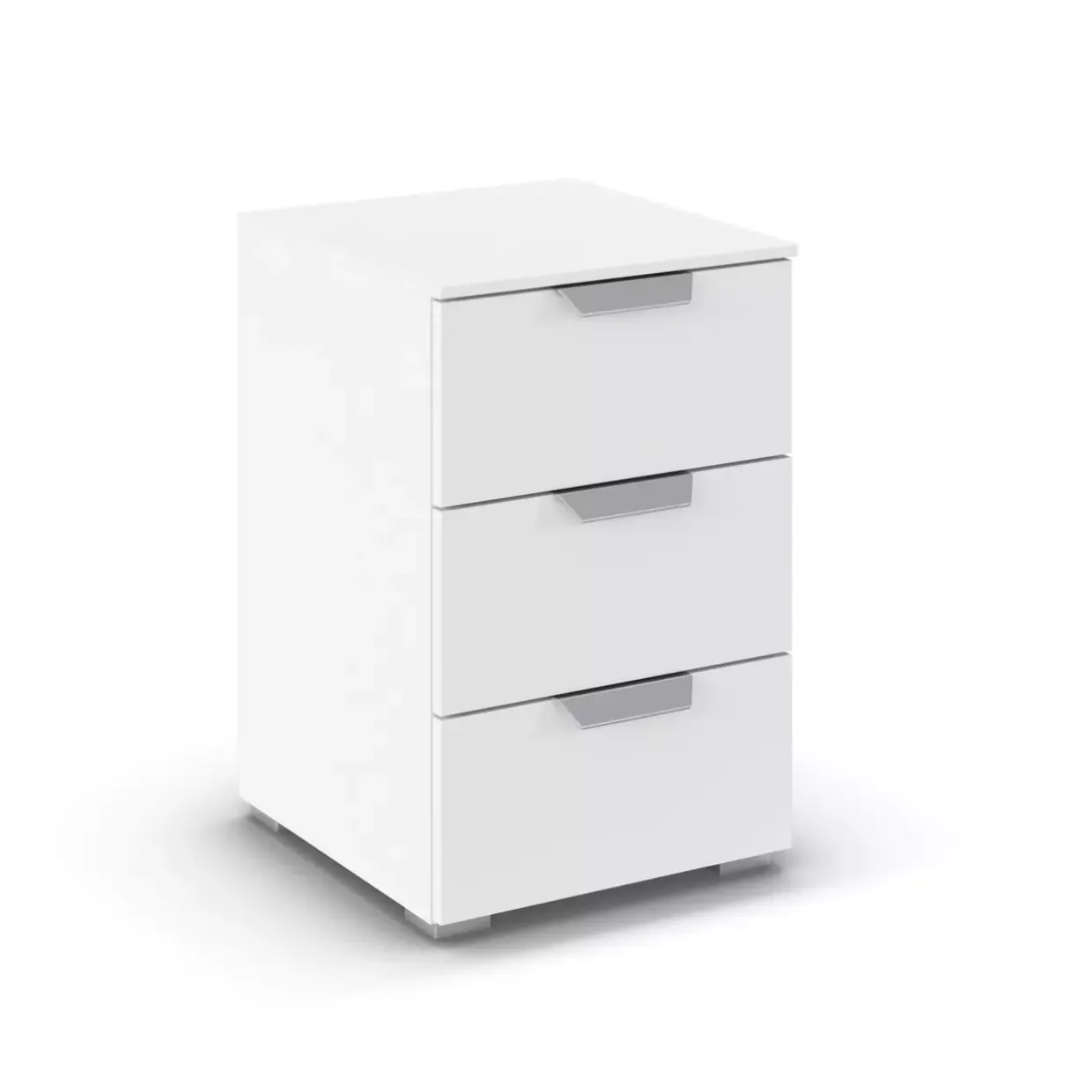 Ein Highlight dieses modernen Nachttisches ist sein Soft-Close-System, das für ein sanftes und leises Schließen der Schubkästen sorgt. Entworfen im zeitgemäßen Stil, fügt sich das Möbelstück harmonisch in jedes moderne Schlafzimmerambiente ein. Mit seiner alpinweißen Dekoroberfläche und den alufarbenen Akzenten entsteht ein elegantes Gesamterscheinungsbild. Funktionalität trifft auf Design: Die drei Schubkästen mit Selbsteinzug und Dämpfung bieten großzügigen Stauraum für persönliche Gegenstände und sorgen gleichzeitig für Ordnung und Übersichtlichkeit.