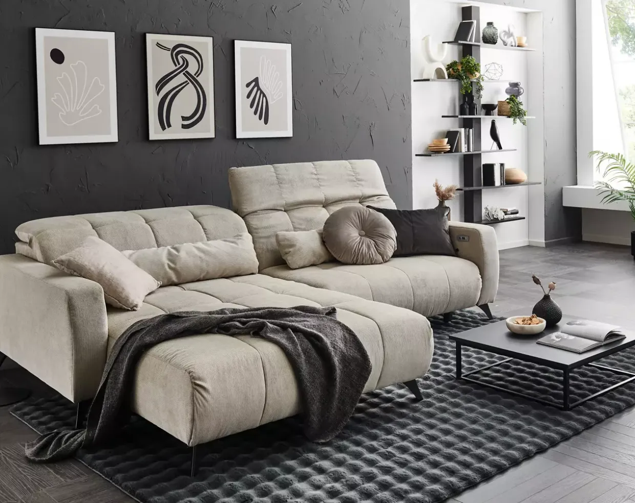 Inkludierte elektrische XXXL-Sitztiefenverstellung sorgt für unvergleichlichen Komfort und Anpassungsfähigkeit, ideal für lange Abende der Entspannung. Die moderne Polstergarnitur in stilvollem Fjord beige/grau und schwarz matt zieht alle Blicke auf sich und fügt sich nahtlos in zeitgemäße Wohnräume ein. Gefertigt aus hochwertigem Stoff und robustem Metall, bietet sie eine langlebige Stabilität und Eleganz.