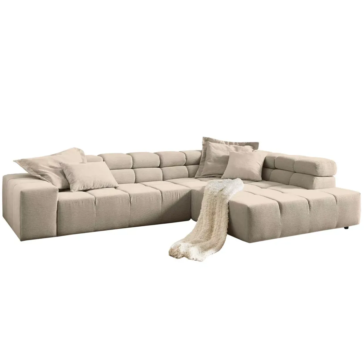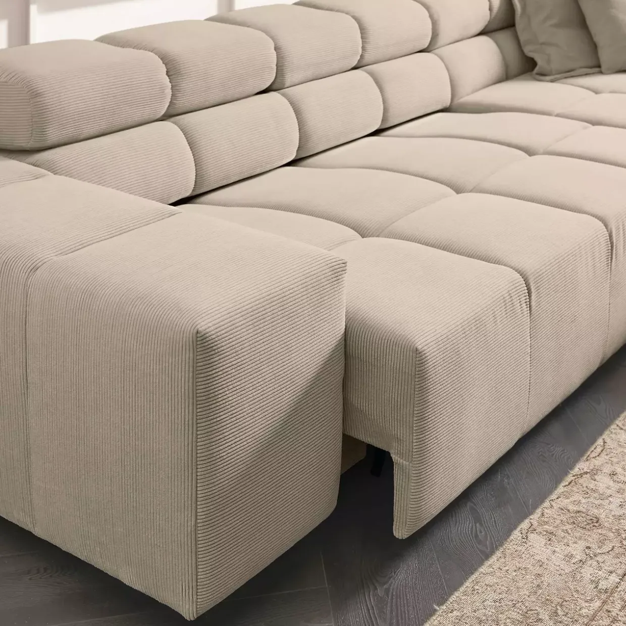 Die verstellbaren Kopfstützen der Funktionsecke Oakland bieten Ihnen individuellen Komfort und unterstützen eine entspannte Sitzposition. Dieses moderne Möbelstück vereint in seinem Design die schlichte Eleganz der Farbe Sand mit der angenehmen Struktur von Cordstoff. Der Echtbezug am Rücken sorgt dafür, dass das Sofa auch mitten im Raum eine gute Figur macht.