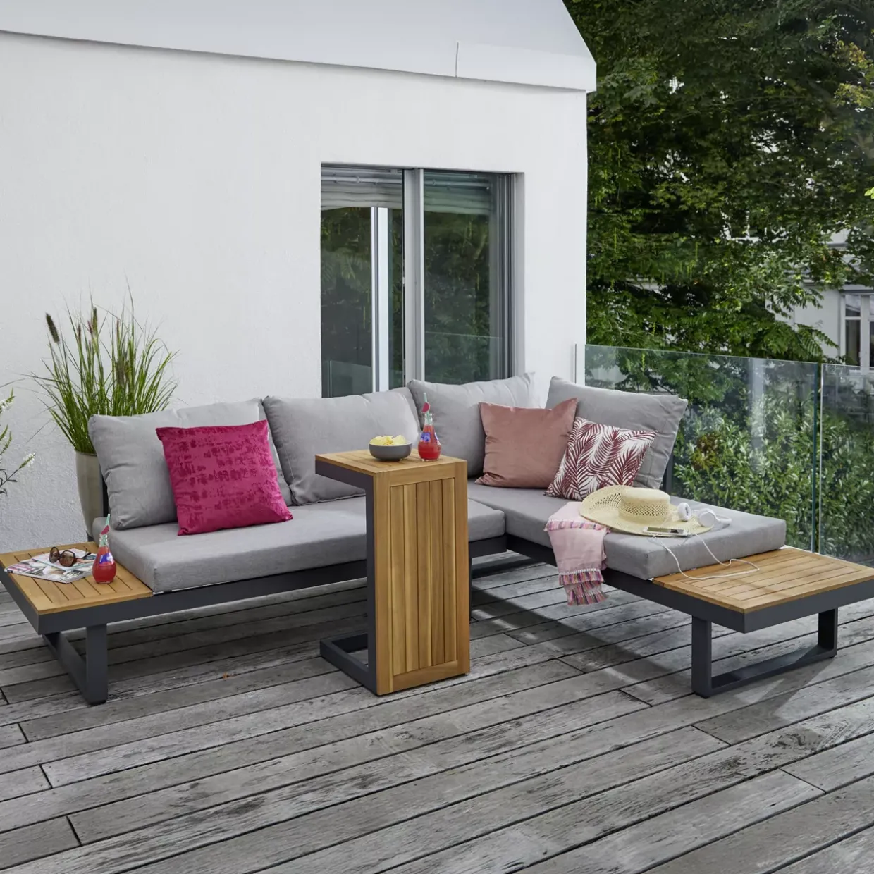 Artikelnummer: n. v. Kategorien: Garten, Gartenlounge-Sets, Loungemöbel Schlagwörter: Grau Sitzkissentest / Gestell Anthrazit / Tischplatte Braun / Tischplatte Teakholzimitat, OUTDOOR Marke: OUTDOOR
