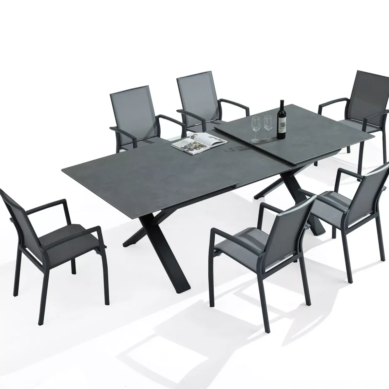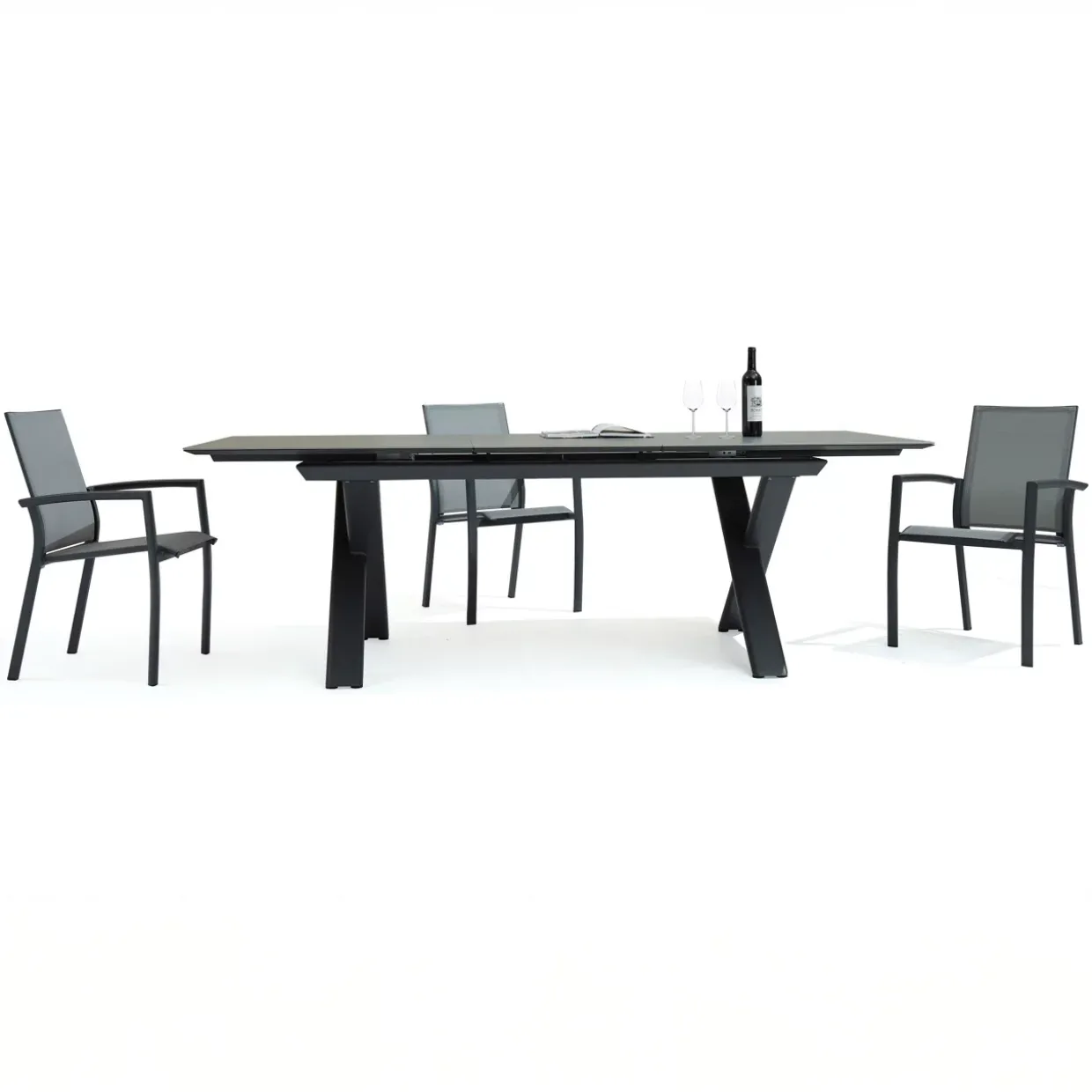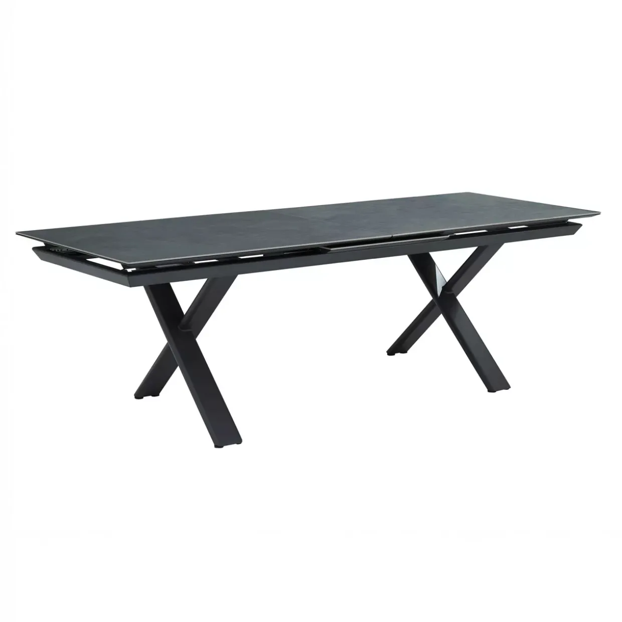 Ein Highlight dieses Gartentisches ist die Tischplatte aus gesintertem Stein, die sowohl stilvoll als auch äußerst strapazierfähig ist. Mit seiner modernen Ausstrahlung fügt sich das Design nahtlos in jedes Outdoor-Ambiente ein, während die anthrazit-dunkelgraue Farbgebung zeitlose Eleganz verkörpert. Der Tisch ist speziell für die warme Sommersaison konzipiert und bietet reichlich Platz, um gesellige Stunden im Freien zu genießen.Das Gestell aus pulverbeschichtetem Aluminium verleiht dem Tisch nicht nur Stabilität, sondern schützt ihn auch zuverlässig vor Witterungseinflüssen. Die X-förmige Fußform sorgt für zusätzliche Standfestigkeit und verleiht dem Tisch einen besonderen ästhetischen Reiz. Flexibilität wird großgeschrieben: Dank der Ausziehfunktion lässt sich die Tischfläche bei Bedarf erweitern und bietet so genügend Platz für spontane Gäste.Metall und Stein als Materialien garantieren eine lange Lebensdauer und einfache Pflege. Die Beine des Tisches, gefertigt aus 120x40mm Rohr mit einer Stärke von 1,5mm, unterstreichen die hochwertige Verarbeitung und das durchdachte Design. Dieser Gartentisch vereint Funktionalität mit moderner Eleganz und wird sicherlich zum Mittelpunkt jedes Gartens oder jeder Terrasse.