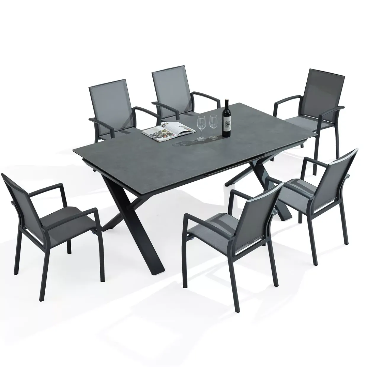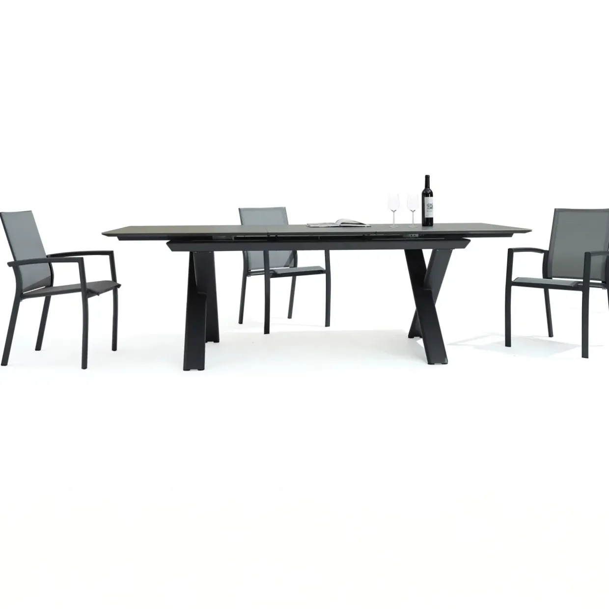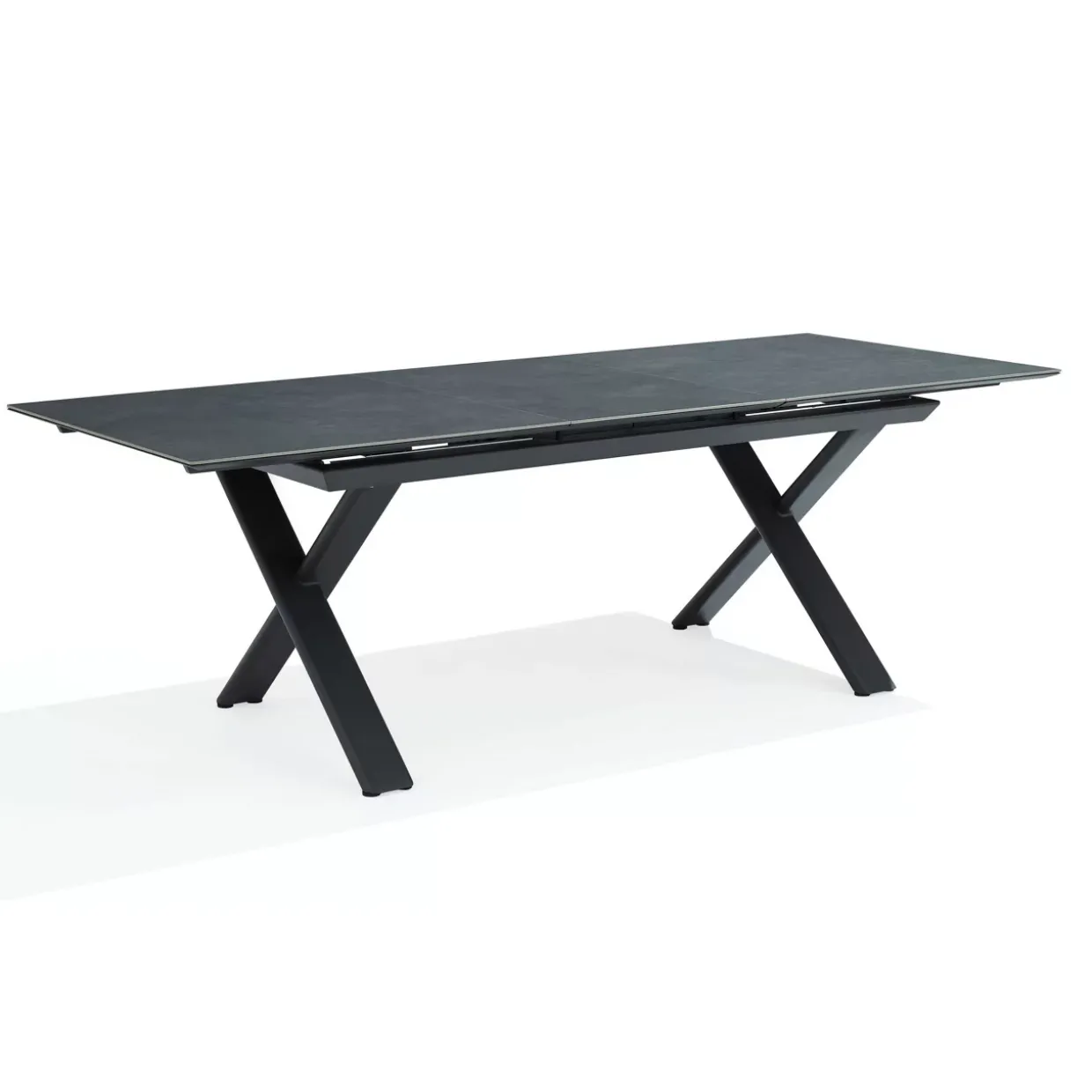 ausziehbar, 180/240 cm; Größe: 180/240x75x100 cm; Gestell aus pulverbeschichtetem Aluminium, anthrazit; Bein aus 120x40mm Rohr, 1,5mm, anthrazit; Platte: 6mm gesintertem Stein, dunkelgrauDie Tischplatte aus gesintertem Stein verleiht diesem Gartentisch eine einzigartige und edle Note. Perfekt für den Sommer gestaltet, verbindet das Design moderne Eleganz mit praktischer Funktionalität. Das Gestell aus pulverbeschichtetem Aluminium sorgt nicht nur für Stabilität, sondern auch für eine ansprechende Optik in Anthrazit und Dunkelgrau.Mit der ausziehbaren Funktion passt sich der Tisch flexibel an unterschiedliche Anlässe an, ob gemütliches Beisammensein oder größere Gartenfeste. Die X-Fußform verleiht dem Möbelstück nicht nur einen modernen Look, sondern bietet auch zusätzliche Stabilität. Dank der robusten Konstruktion aus Metall und Stein ist der Gartentisch besonders langlebig und widerstandsfähig gegen äußere Einflüsse.Der Einsatz von pulverbeschichtetem Aluminium gewährleistet eine einfache Pflege und hohe Witterungsbeständigkeit, ideal für den Außenbereich. Die Beine aus 120×40 mm Rohr mit einer Materialstärke von 1,5 mm unterstreichen die solide Bauweise und bieten sicheren Stand.Ein Gartentisch, der nicht nur optisch überzeugt, sondern auch durch seine vielseitigen Einsatzmöglichkeiten. Er lädt dazu ein, in stilvoller Umgebung den Sommer zu genießen und bietet dabei höchste Funktionalität und Qualität. Entdecken Sie die Perfektion in jedem Detail und genießen Sie unvergessliche Momente im Freien.