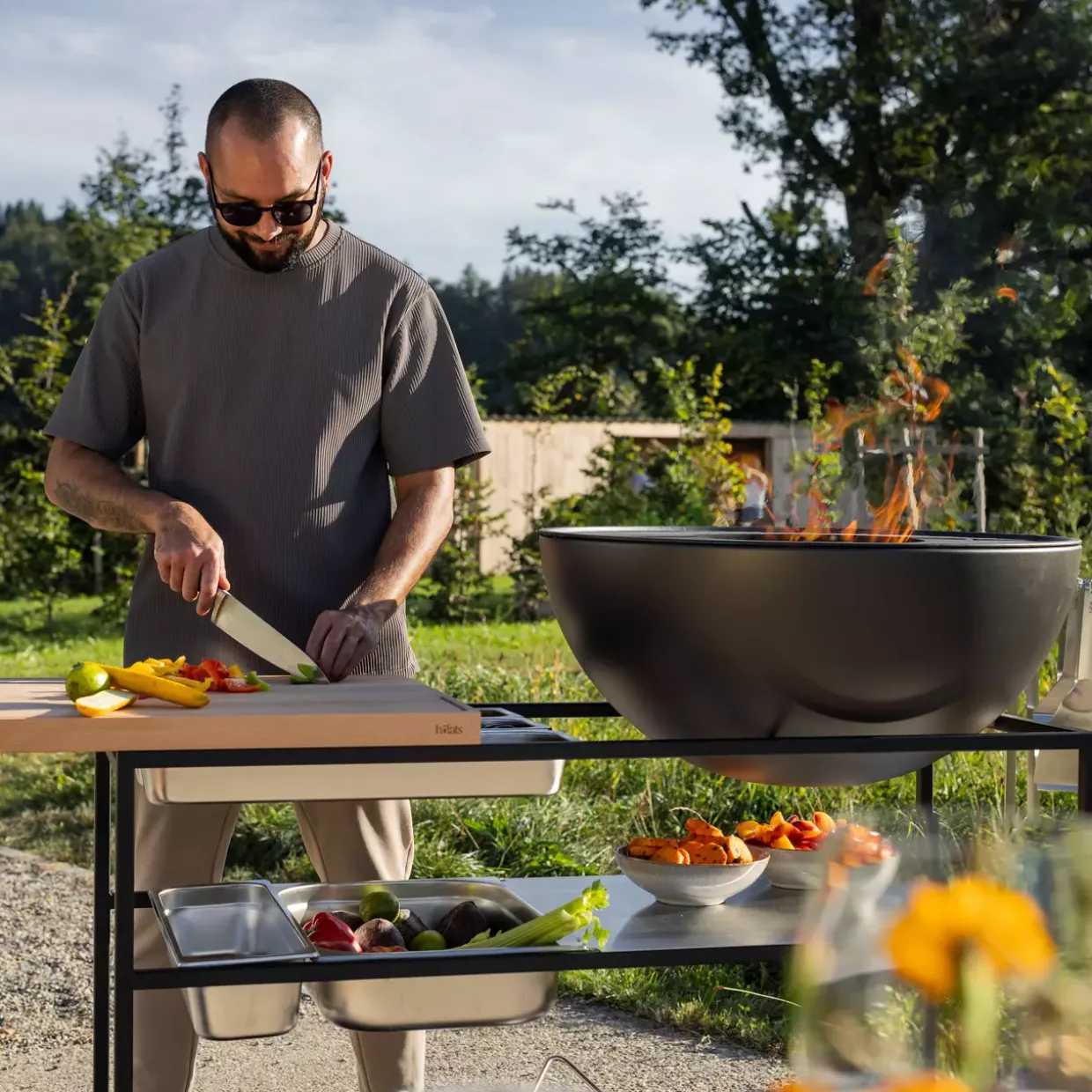 Die FIRE KITCHEN mit BOWL 70 vereint modernes Design mit praktischer Funktionalität. Edelstahl und Buchenholz harmonieren perfekt und verleihen der mobilen Outdoor-Küche ein stilvolles Aussehen. Ein stabiler, geschweißter Rahmen mit hochwertiger Pulverbeschichtung garantiert Langlebigkeit und Robustheit. Die Kombination aus Holz und Metall bietet nicht nur ästhetische Anziehungskraft, sondern auch Beständigkeit für den alltäglichen Gebrauch.
