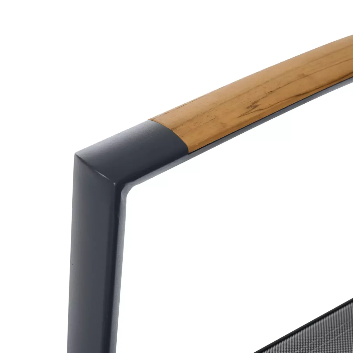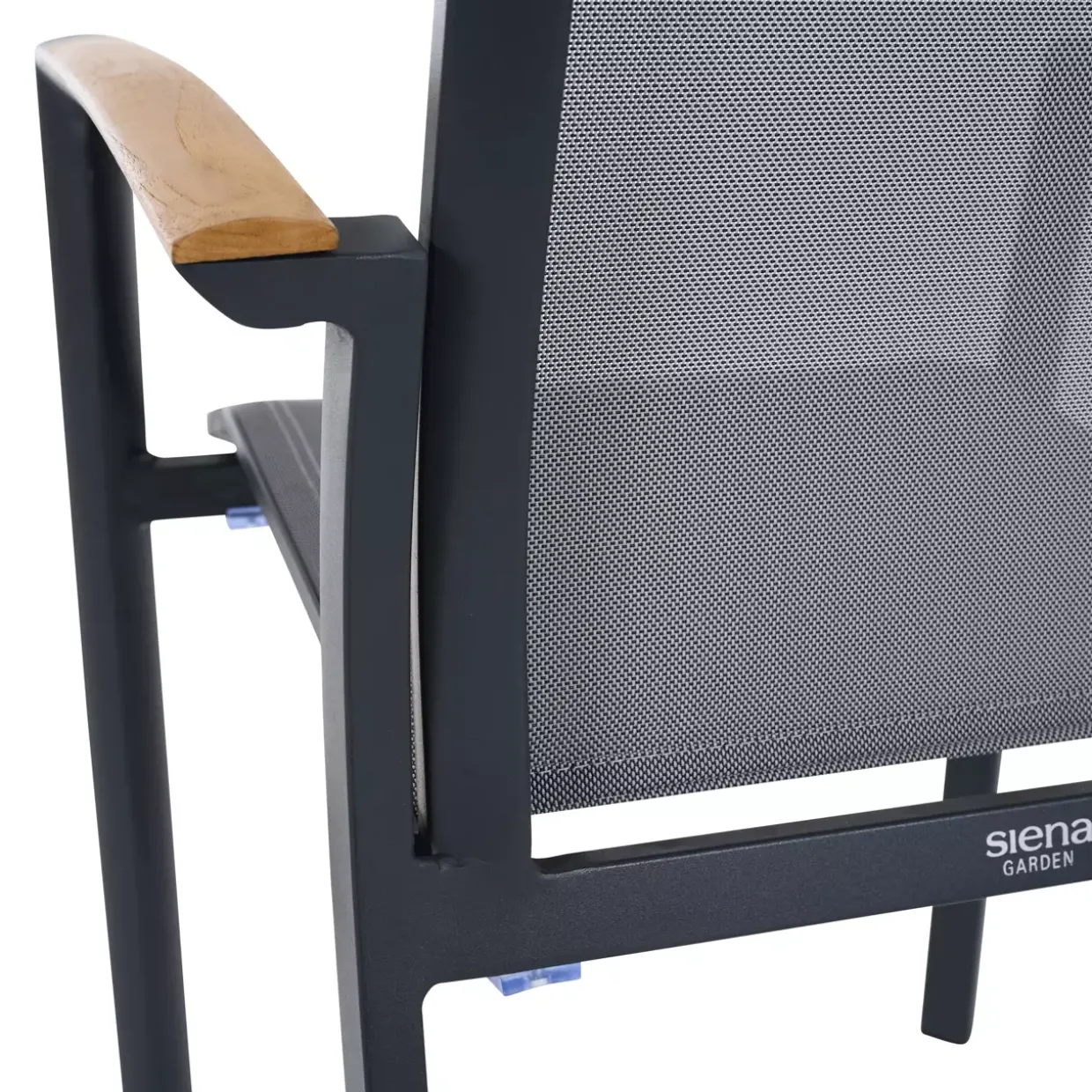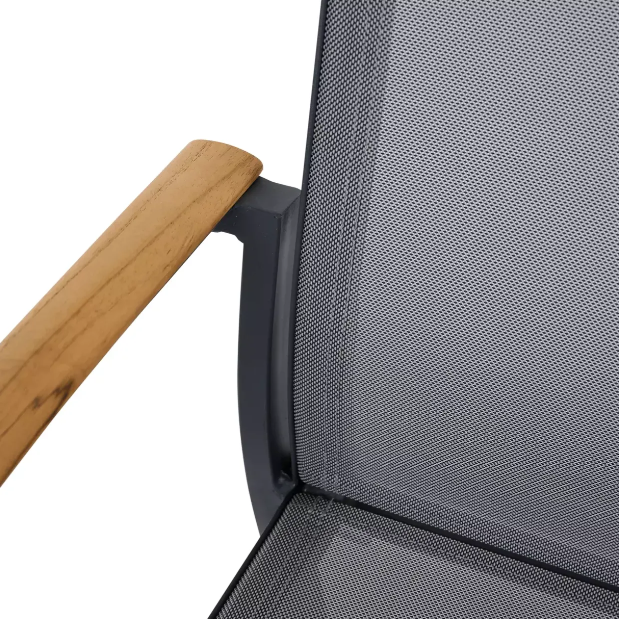 Stapelsessel VELIA; Gestell und Armlehnen aus Aluminium pulverbeschichtet in matt anthrazit; Flächen aus Ranotex®-Gewebe 1×1 in schwarz-grau; Armlehneninlay aus Teakholz FSC® 100% in natur