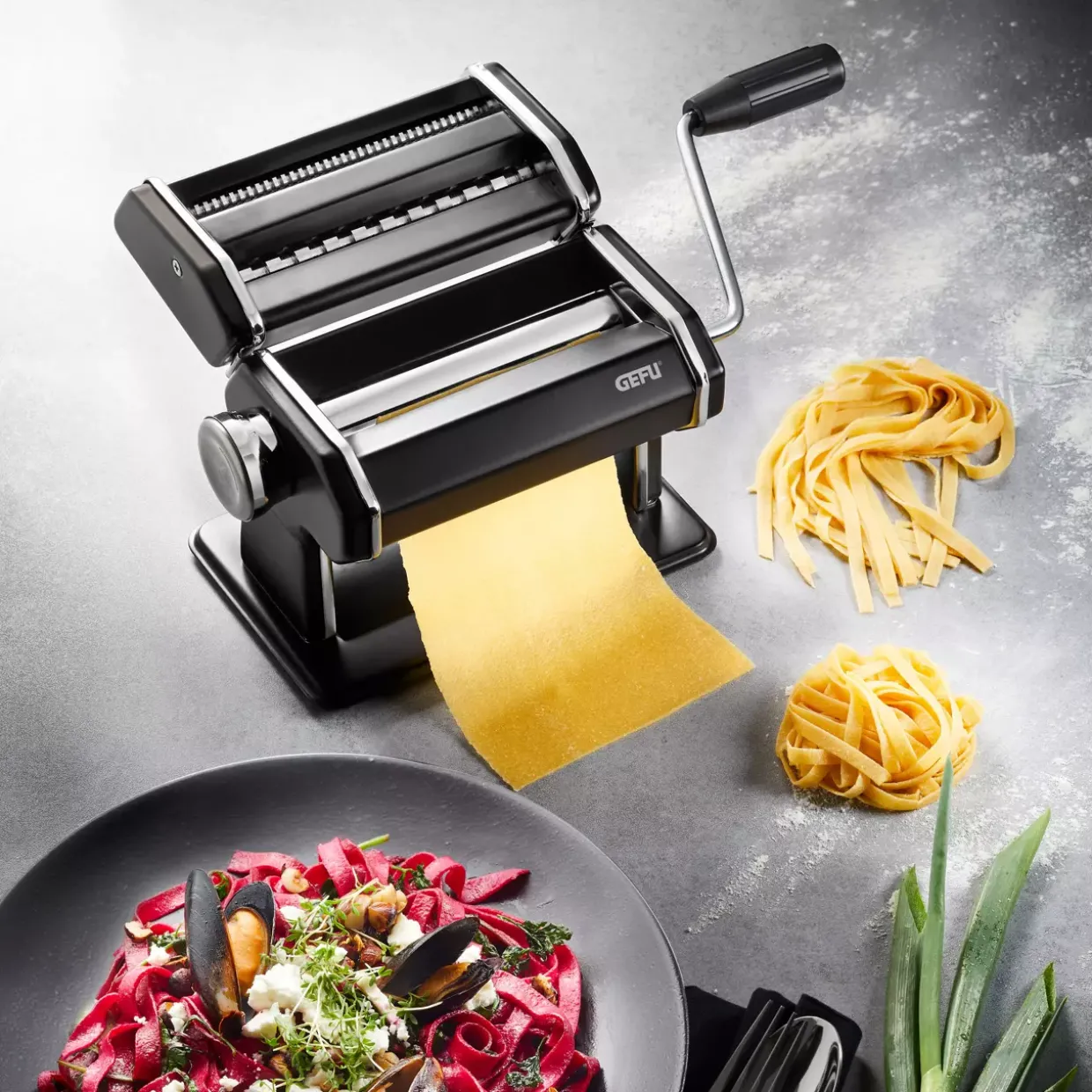 Ein eleganter, schwarz mattierter Blickfang ist die Pasta Perfekta, die in jeder Küche moderne Akzente setzt. Diese Nudelmaschine kombiniert Funktionalität mit einem stilvollen Design, um Ihnen das perfekte Pasta-Erlebnis zu bieten. Der Kurbelantrieb ermöglicht die Herstellung von frischer Pasta in drei verschiedenen Varianten: Tagliolini, Tagliatelle und Lasagne.